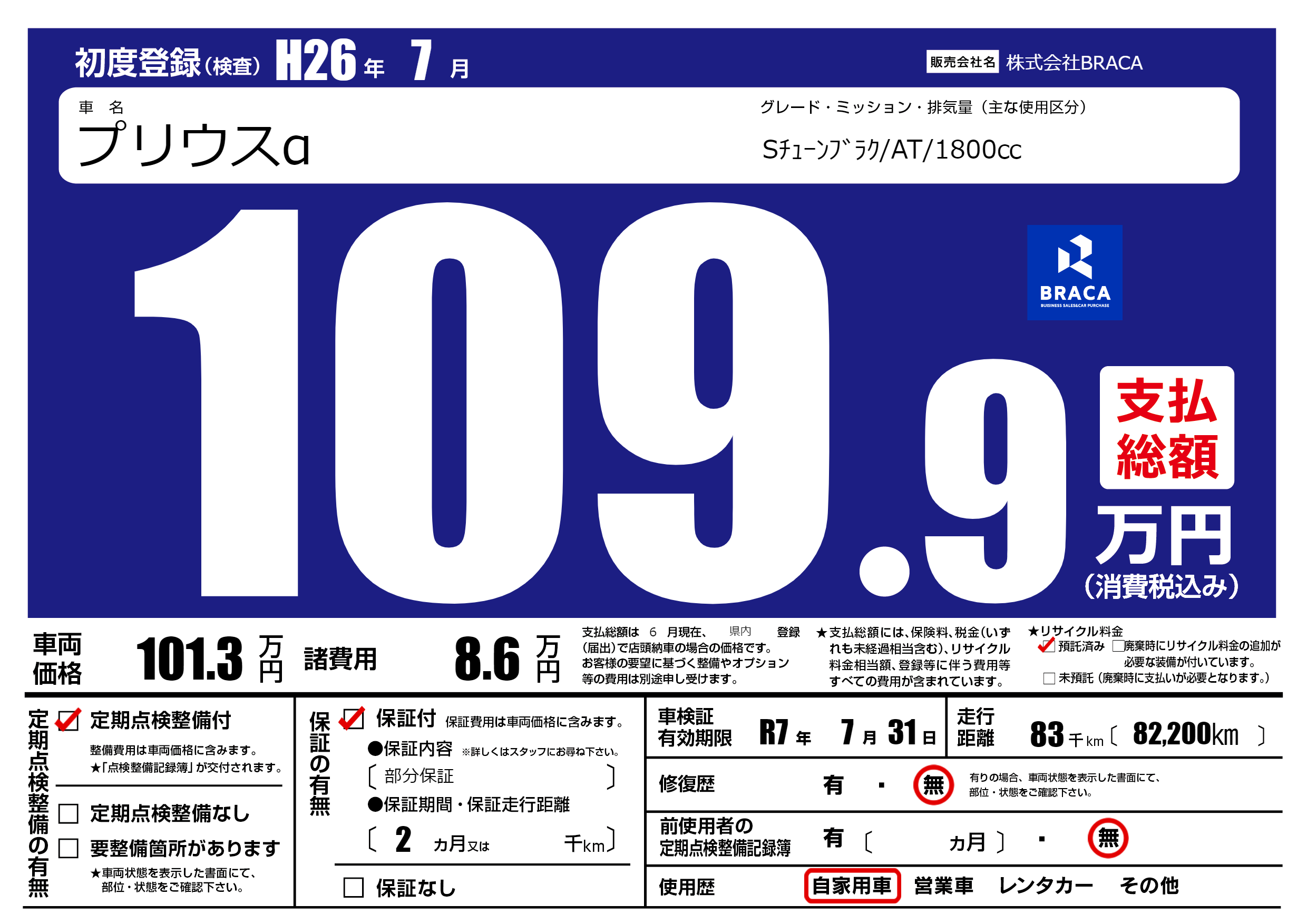 | 走行キロ | 8.3万km | 初年度登録 | H26年7月 |