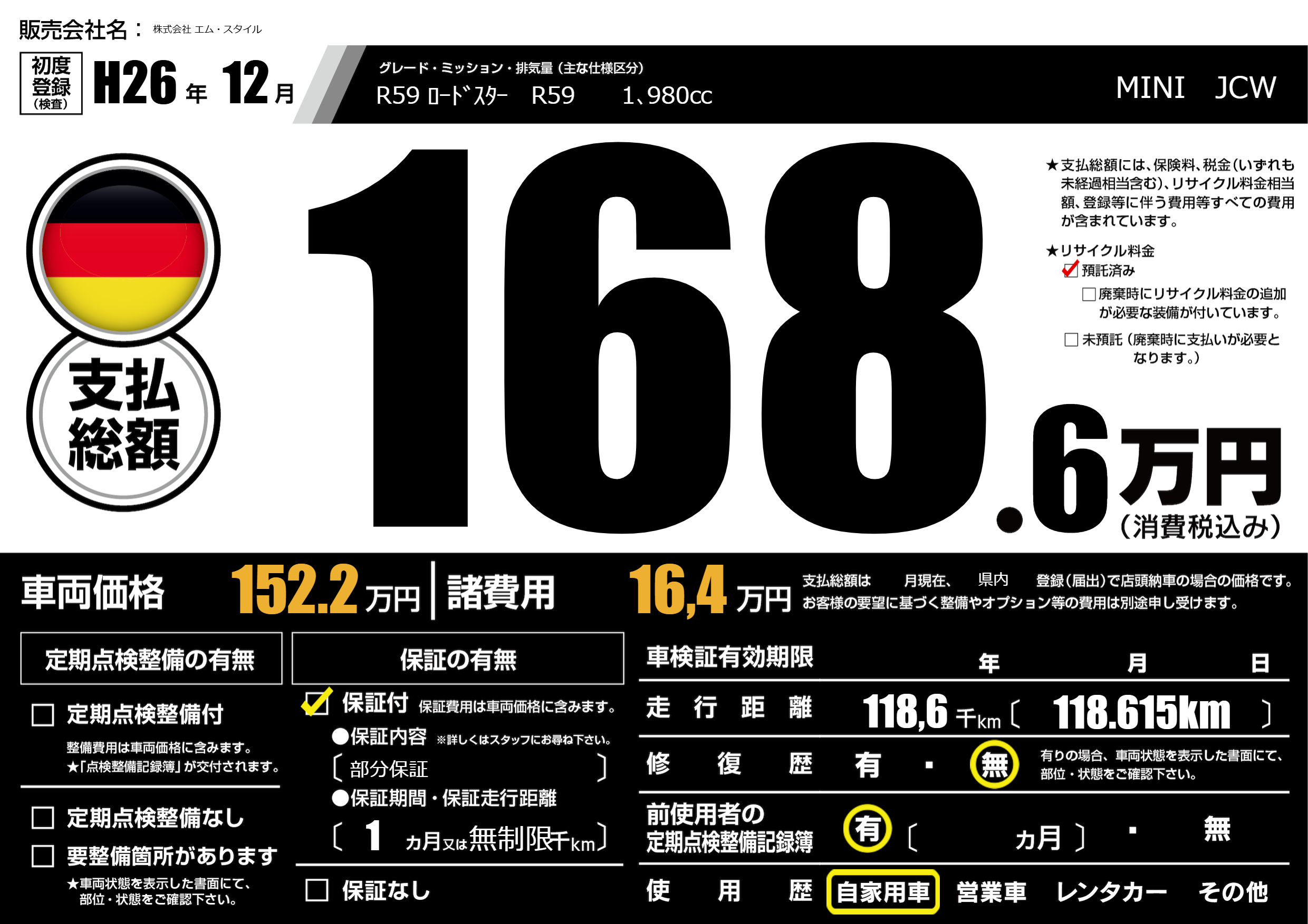 | 走行キロ | 11.8万km | 初年度登録 | H26年12月 |