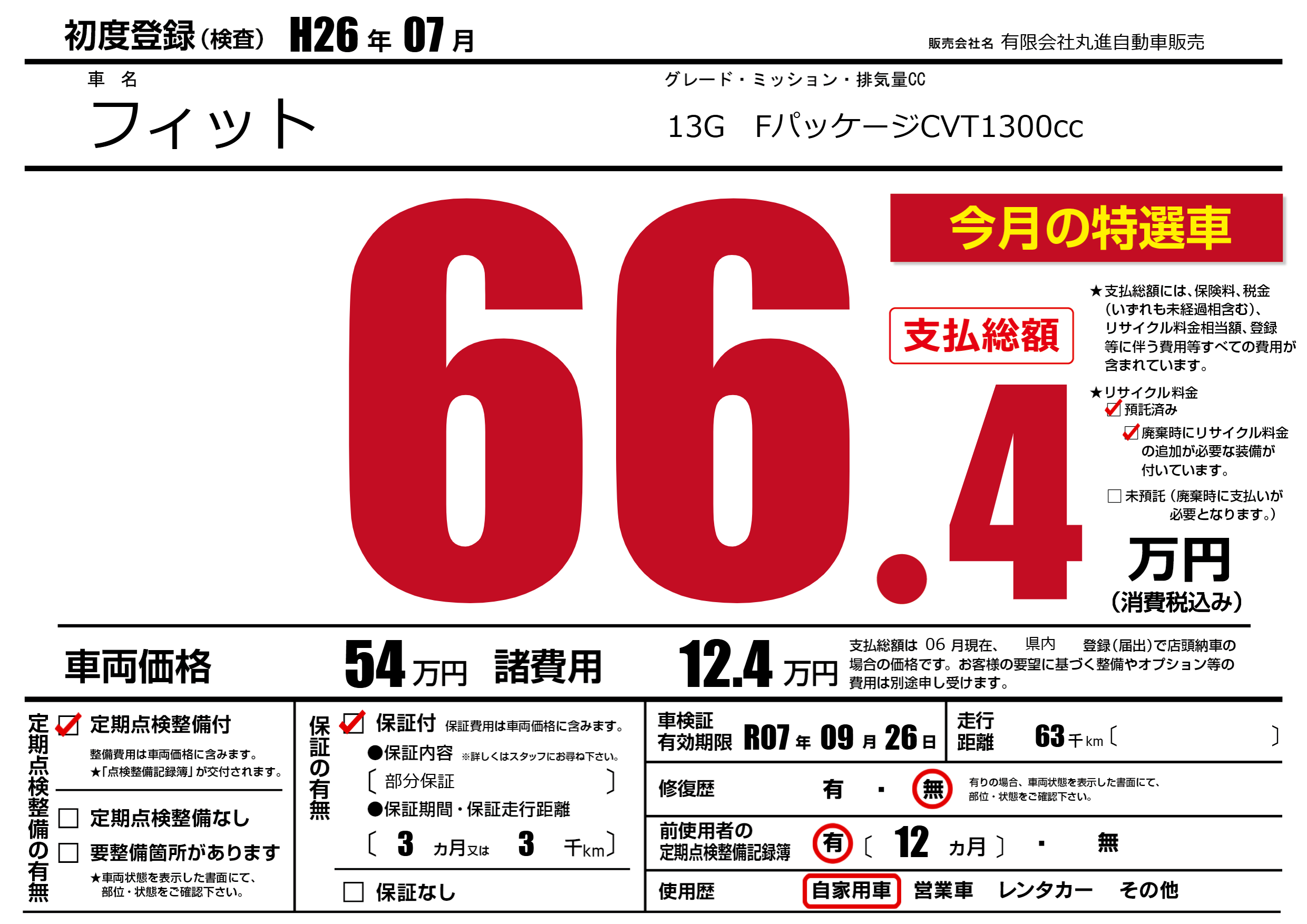 | 走行キロ | 6.3万km | 初年度登録 | H26年07月 |