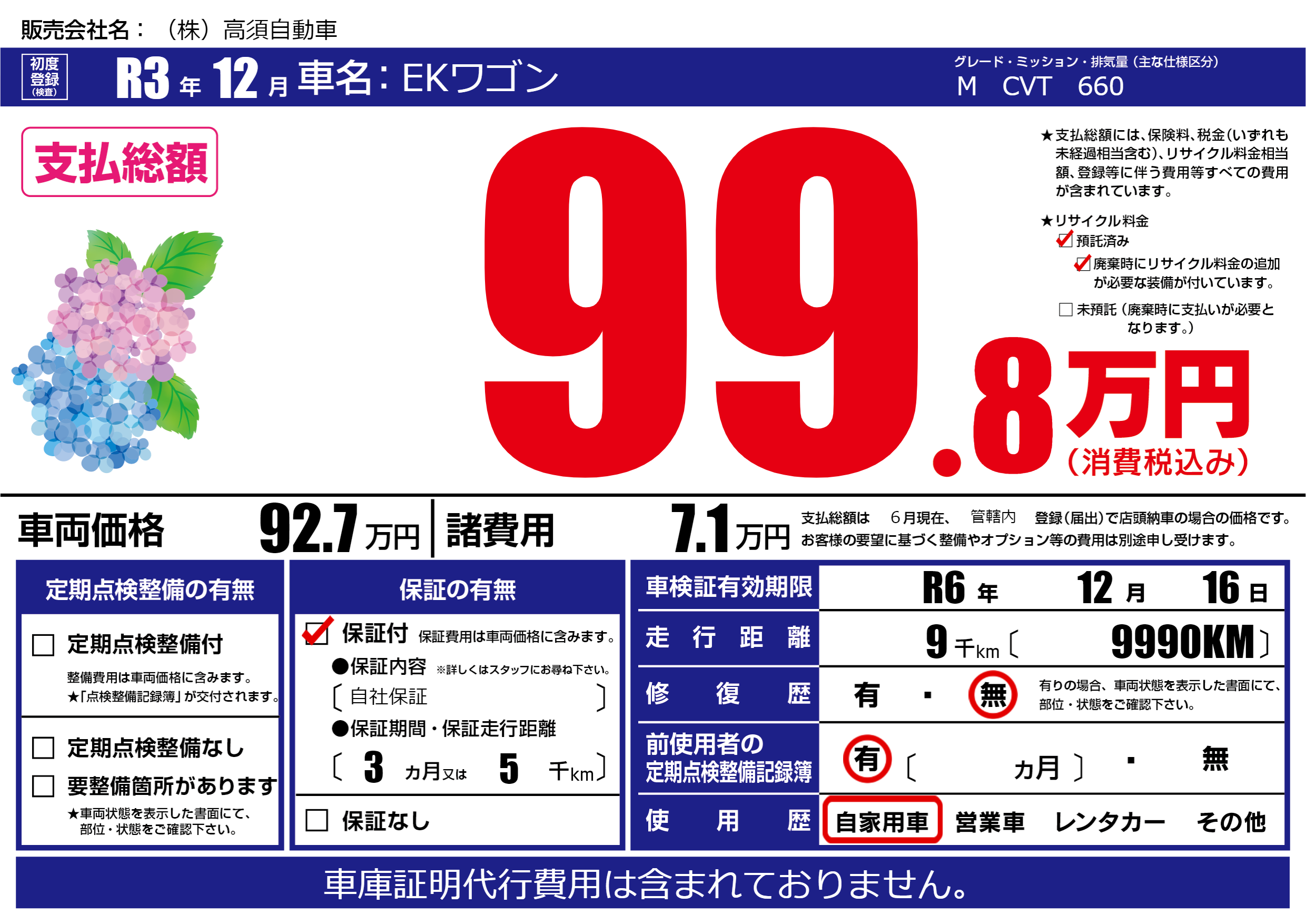 | 車名 | EKワゴン | グレード ミッション 排気量 |