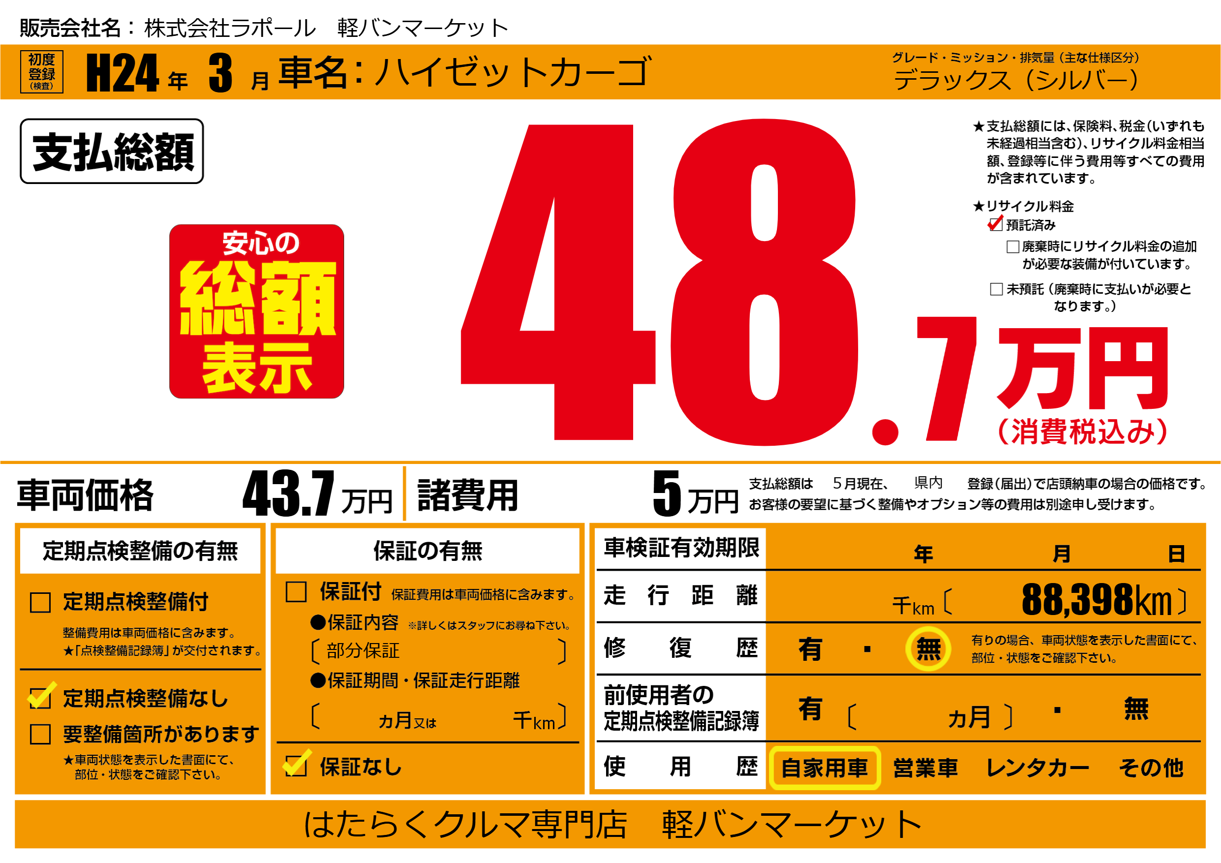 | 車名 | ハイゼットカーゴ | グレード ミッション 排気量 |