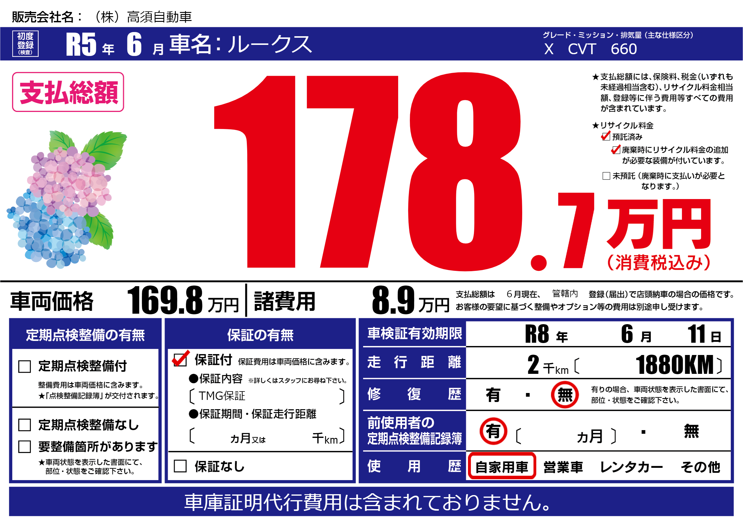 | 走行キロ | 0.2万km | 初年度登録 | R5年6月 |