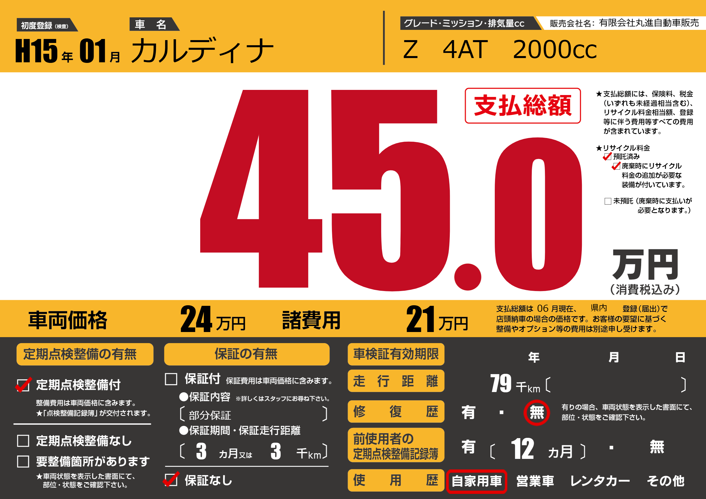| 車名 | カルディナ | グレード ミッション 排気量 |