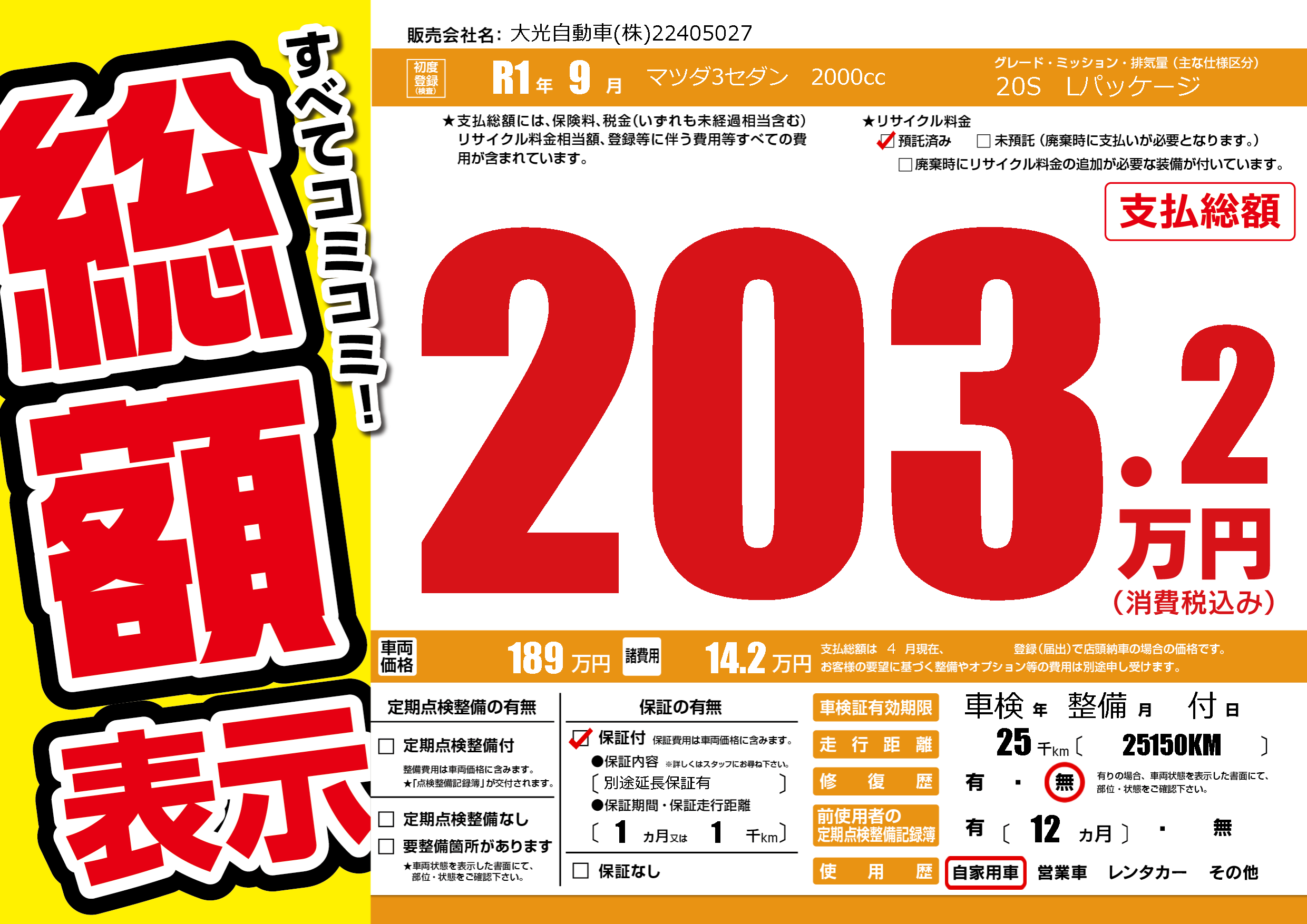 | 車名 | マツダ3セダン 2000cc | グレード ミッション 排気量 |