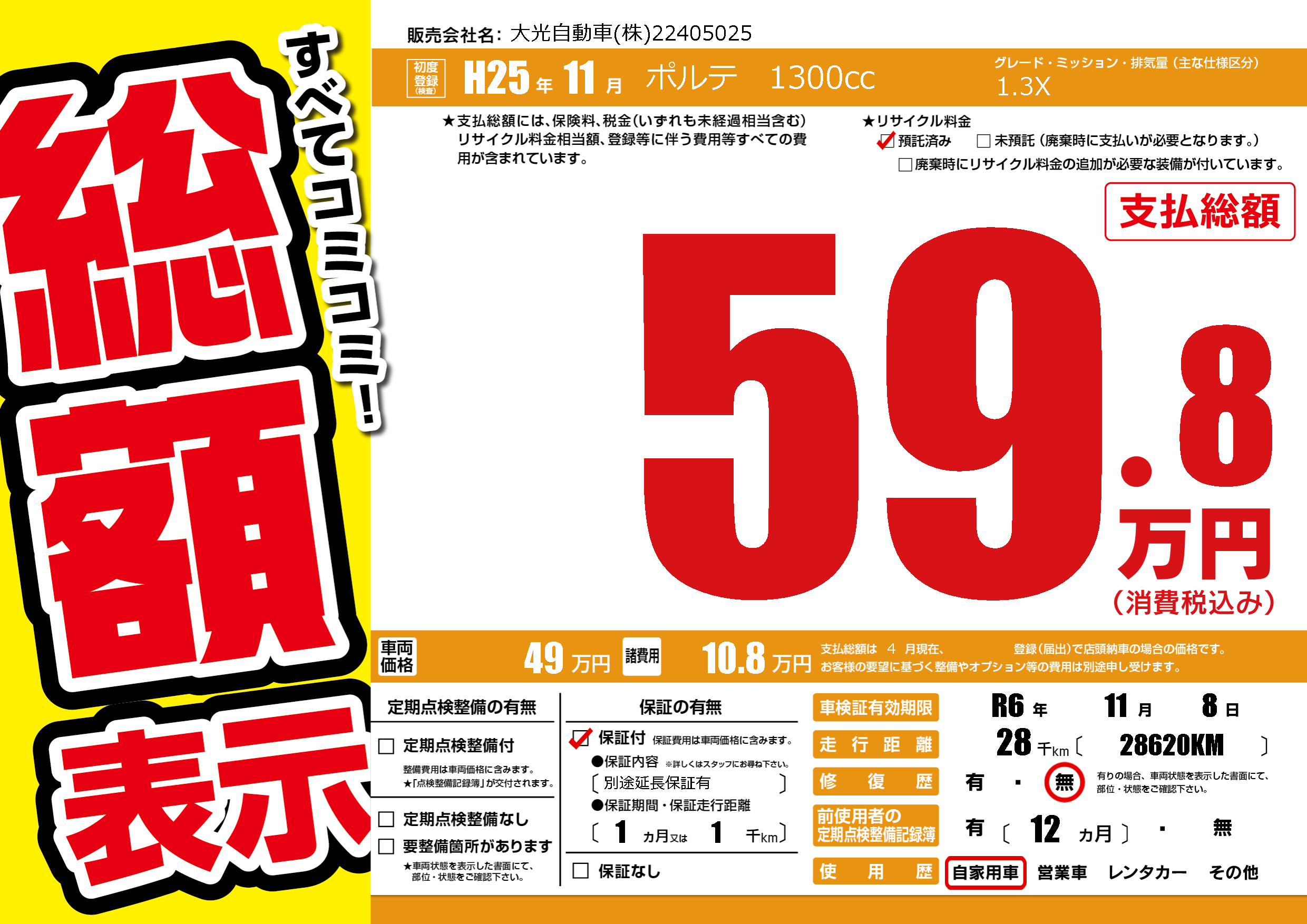 | 車名 | ポルテ 1300cc | グレード ミッション 排気量 |