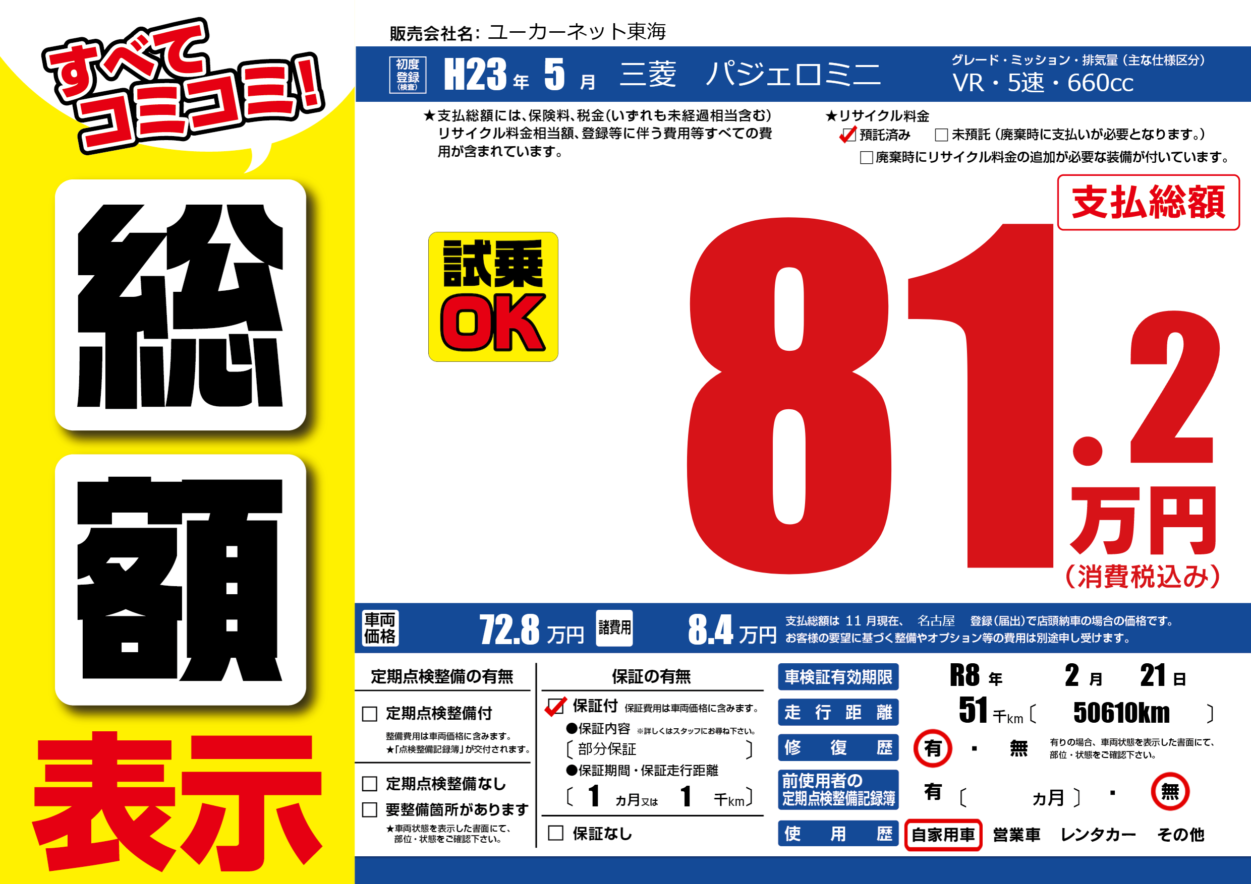 | 車名 | 三菱 パジェロミニ | グレード ミッション 排気量 |