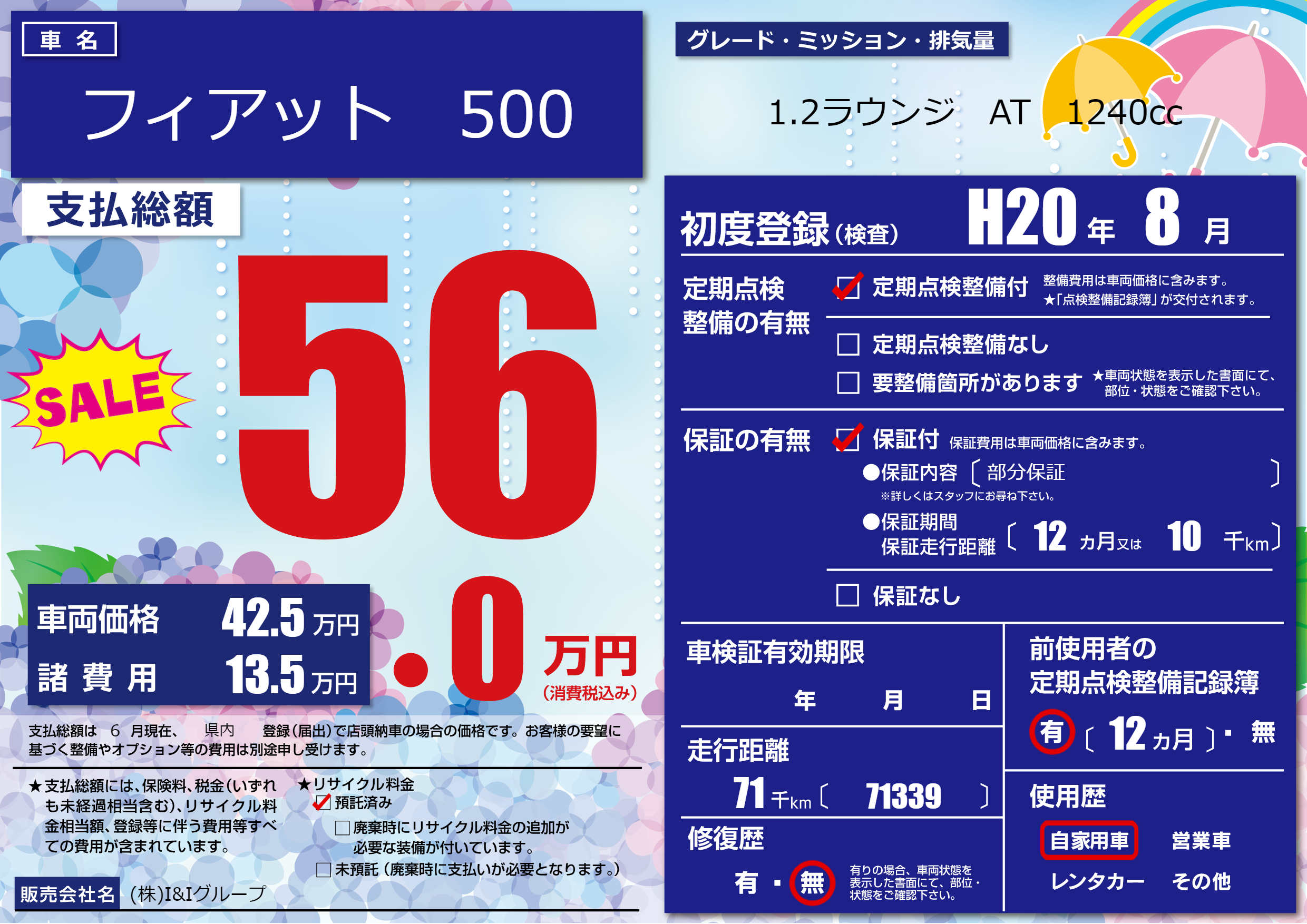 | 車名 | フィアット 500 | グレード ミッション 排気量 |