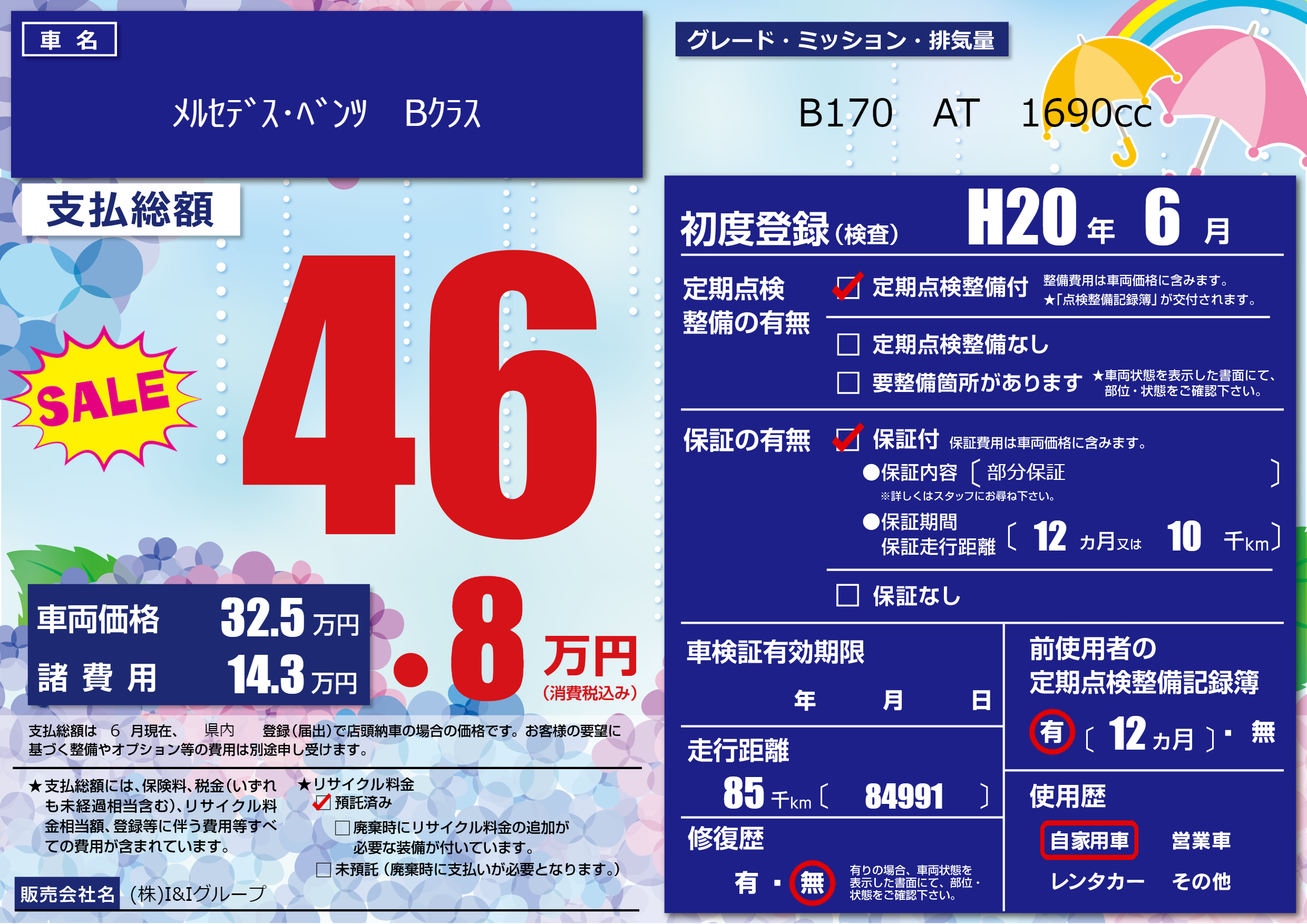 | 車名 | メルセデス・ベンツ Bクラス | グレード ミッション 排気量 |