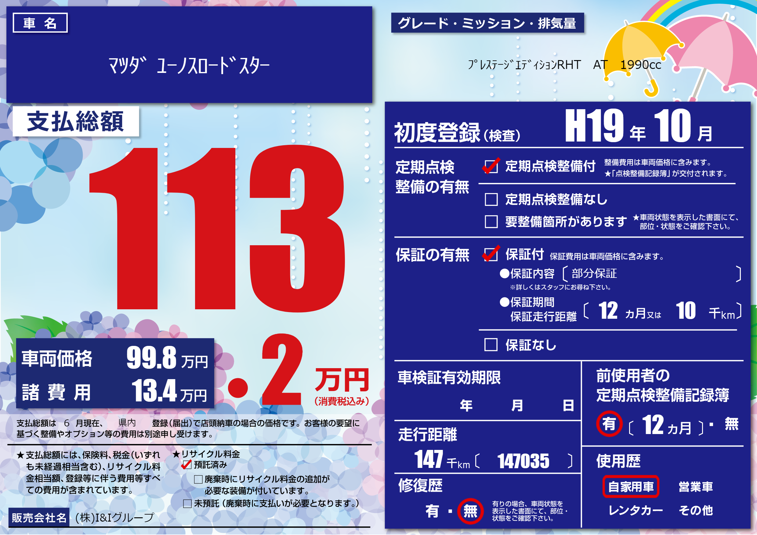 | 走行キロ | 14.7万km | 初年度登録 | H19年10月 |