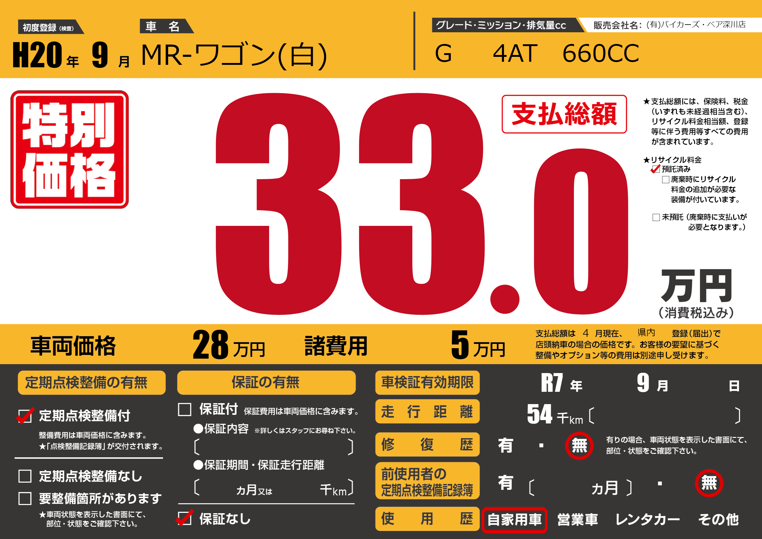 | 車名 | MR-ワゴン(白) | グレード ミッション 排気量 |