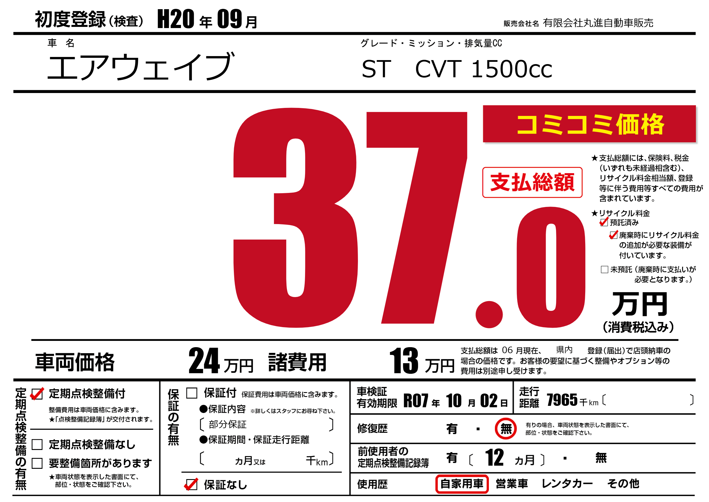 | 車名 | エアウェイブ | グレード ミッション 排気量 |