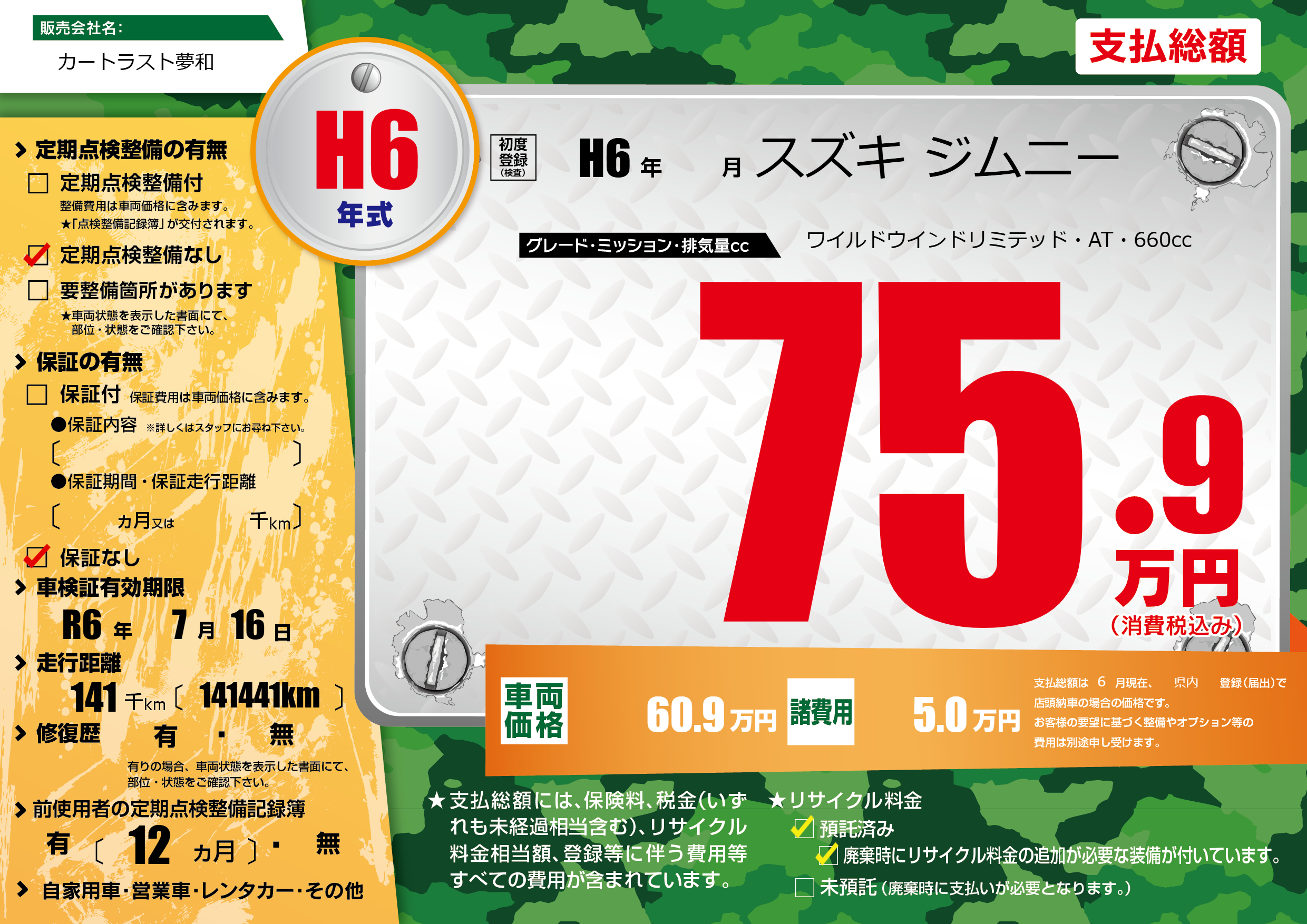 | 車名 | スズキ ジムニー | グレード ミッション 排気量 |