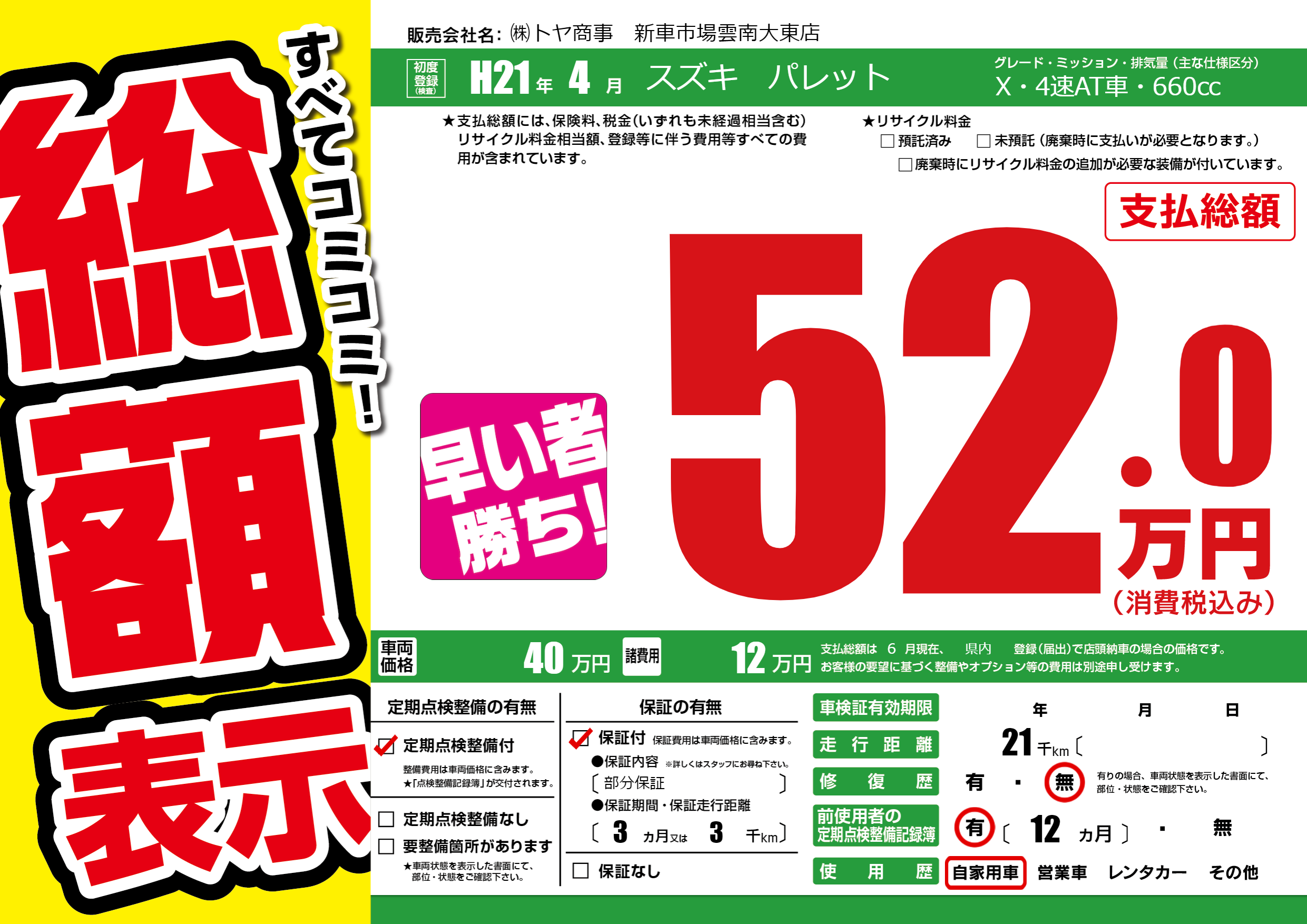 | 車名 | スズキ パレット | グレード ミッション 排気量 |