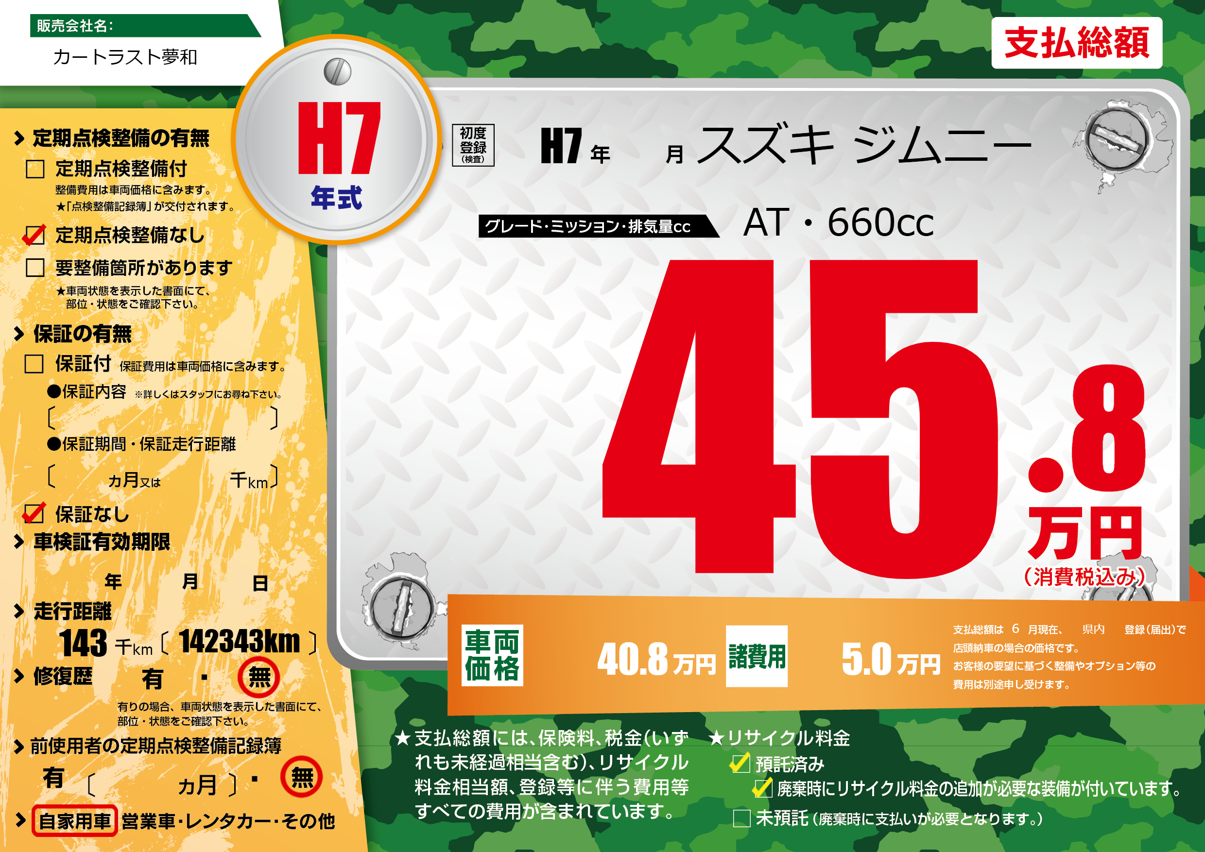 | 走行キロ | 14.3万km | 初年度登録 | H7年---月 |