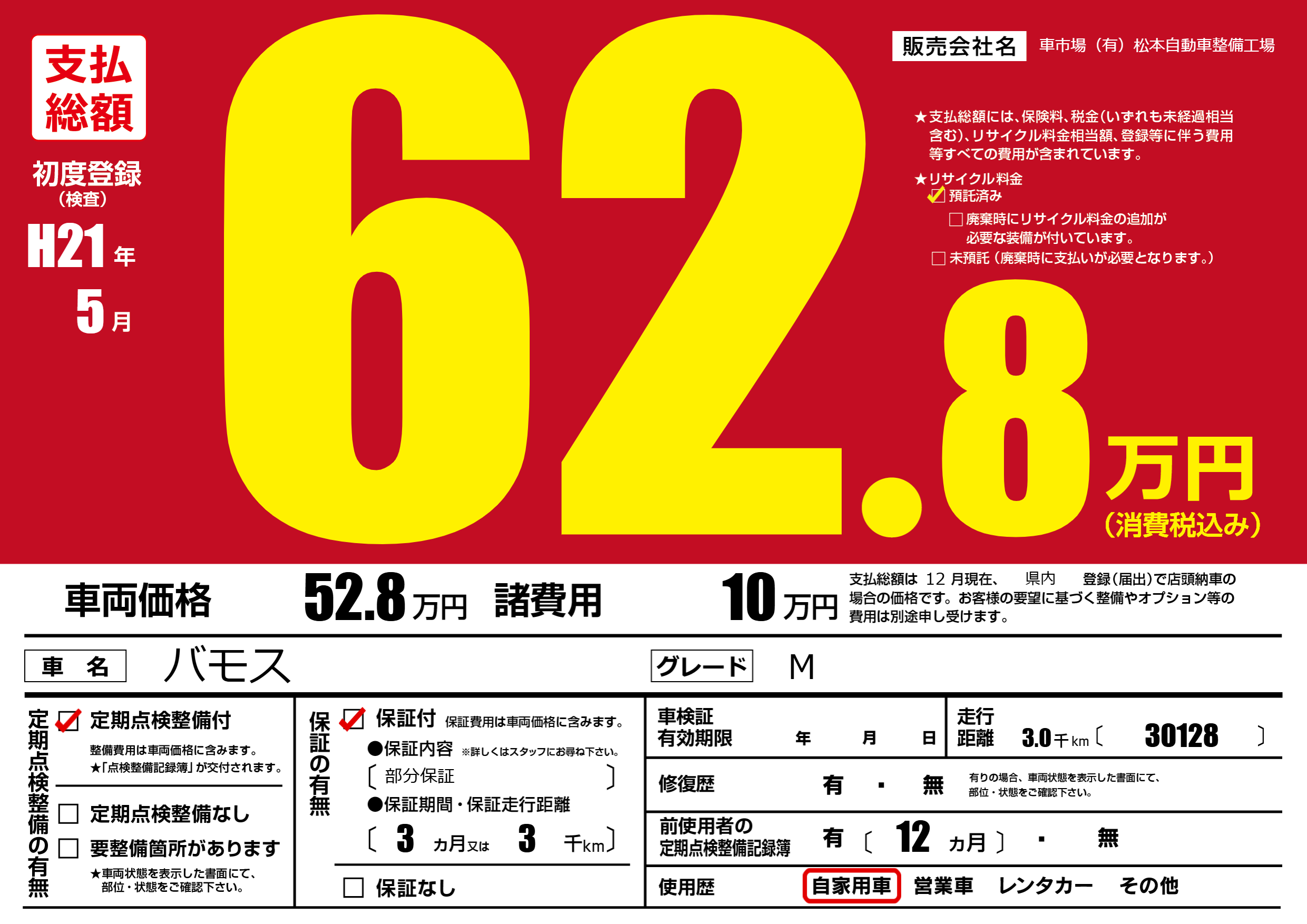 保証付き 保証内容(部分保証) 3ヶ月または(3)千kmまで |
