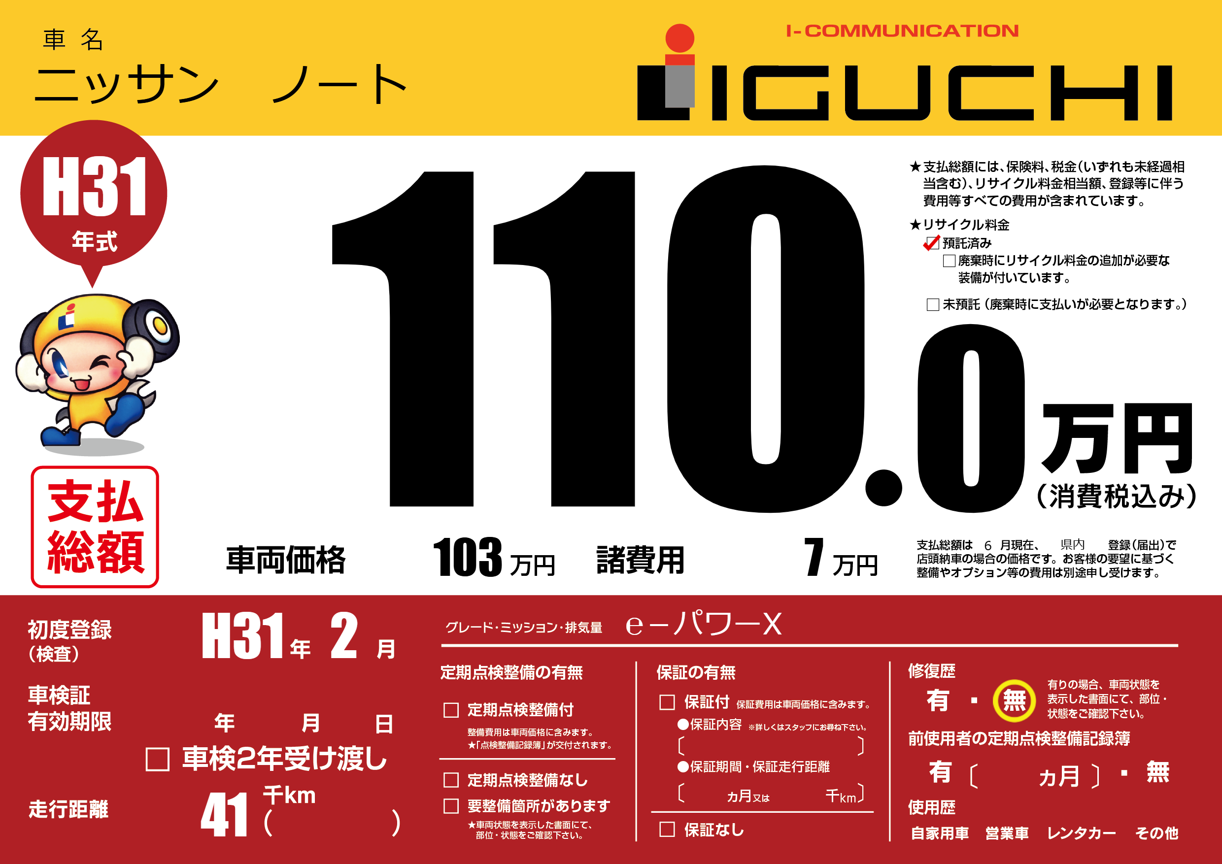 | 走行キロ | 4.1万km | 初年度登録 | H31年2月 |