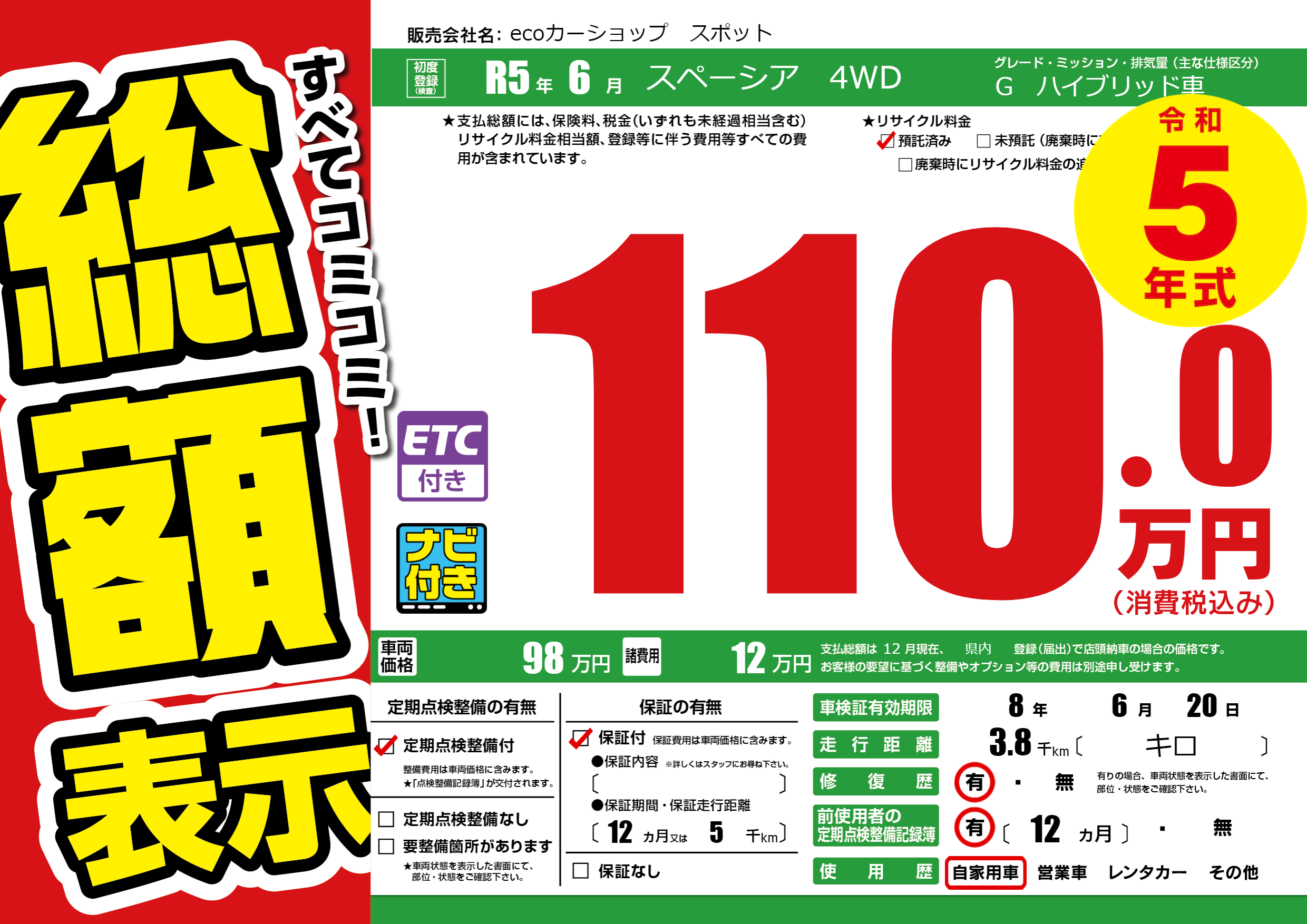 | 車名 | スペーシア 4WD | グレード ミッション 排気量 |