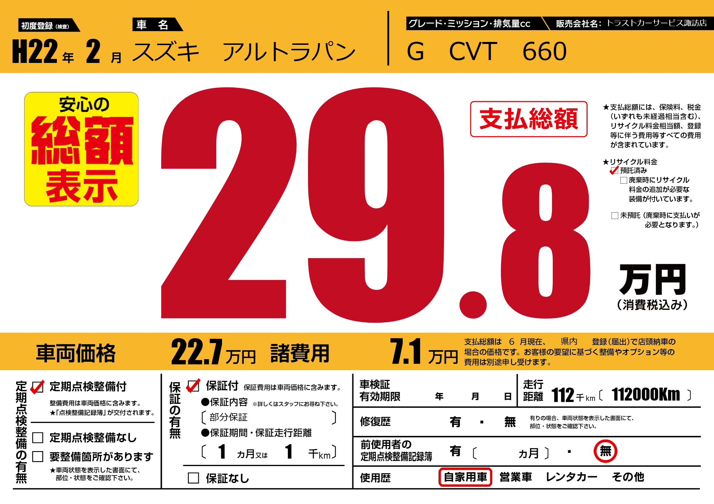 | 走行キロ | 11.2万km | 初年度登録 | H22年2月 |