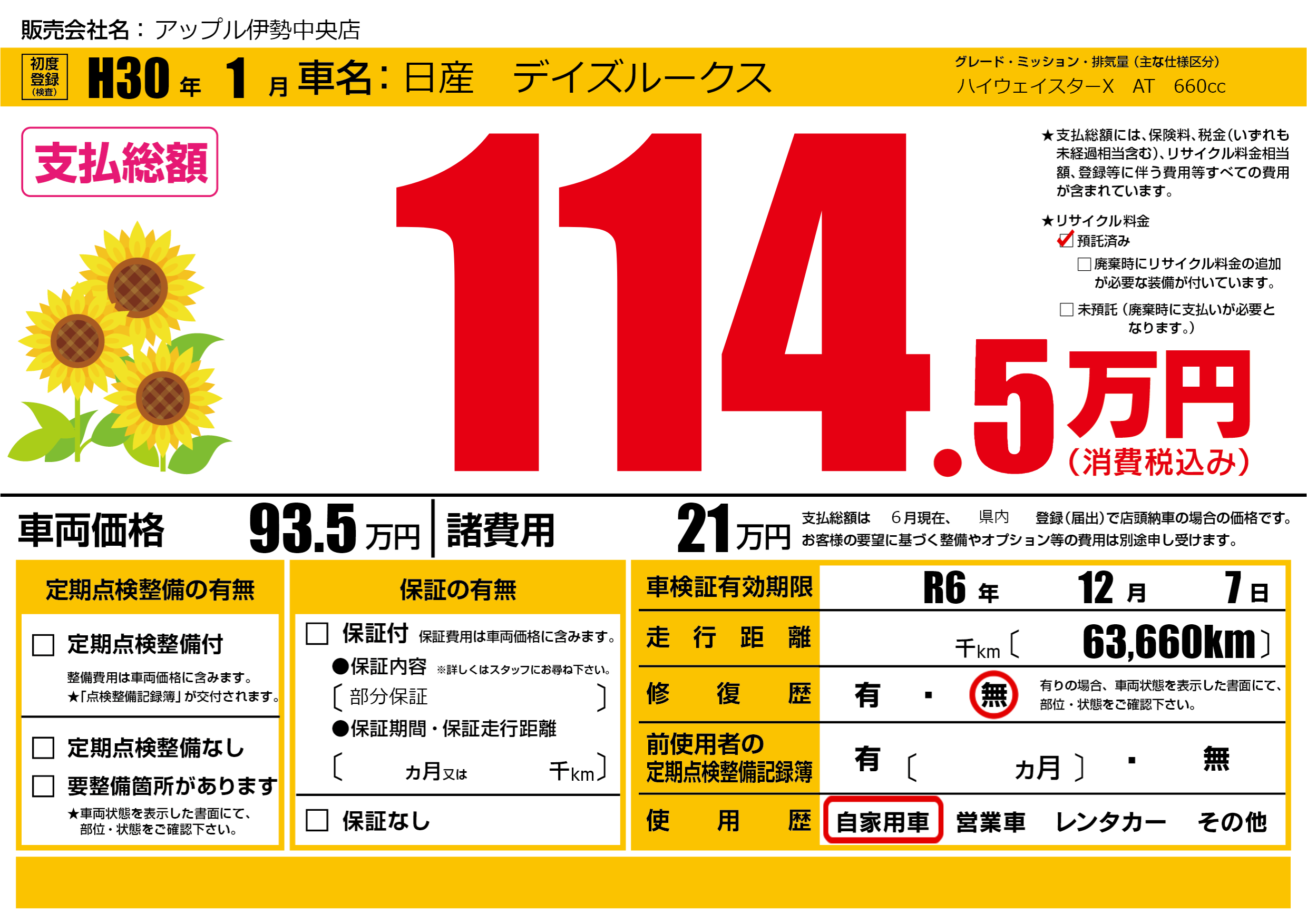 | 走行キロ | - | 初年度登録 | H30年1月 |