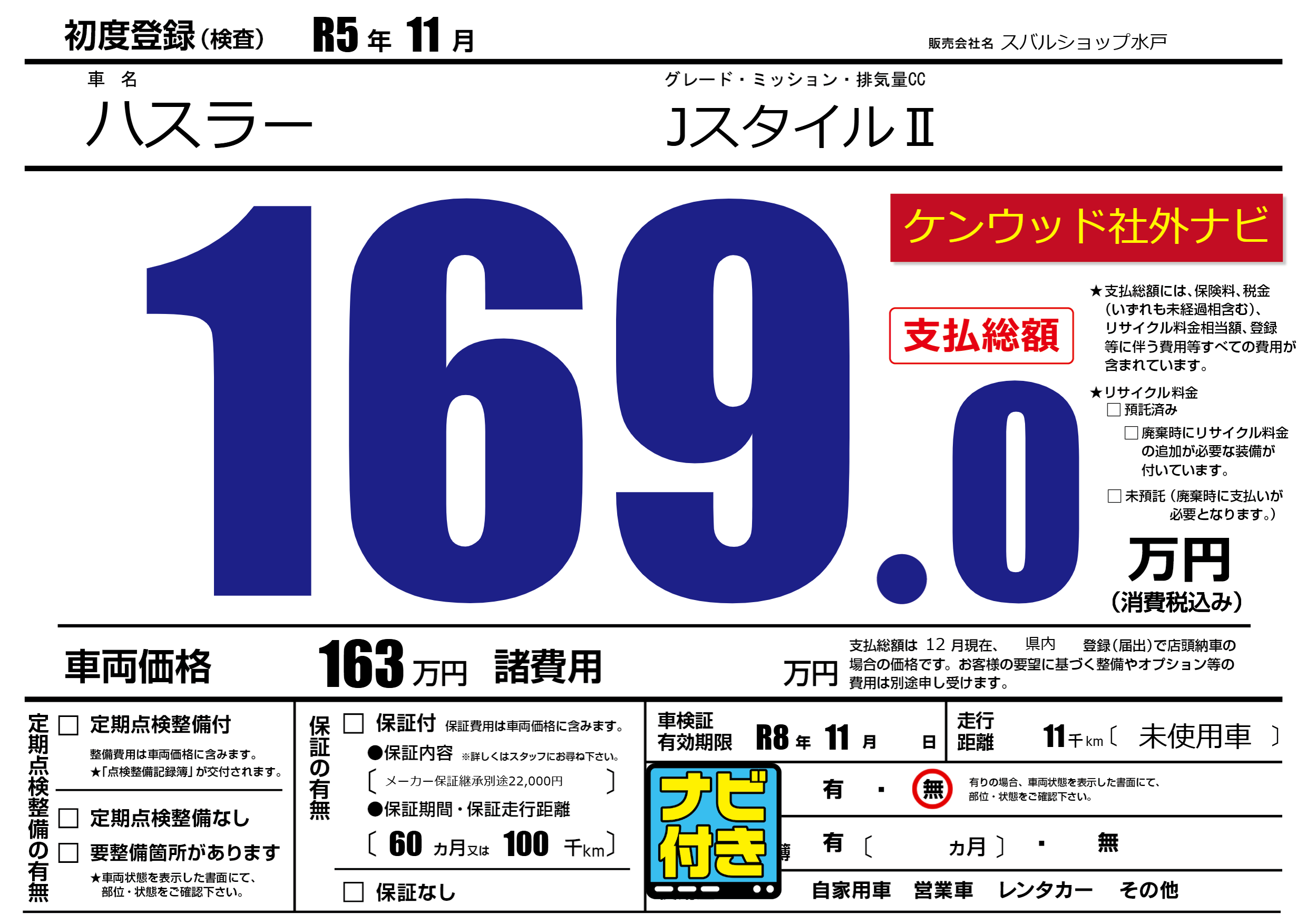 | 走行キロ | 1.1万km | 初年度登録 | R5年11月 |