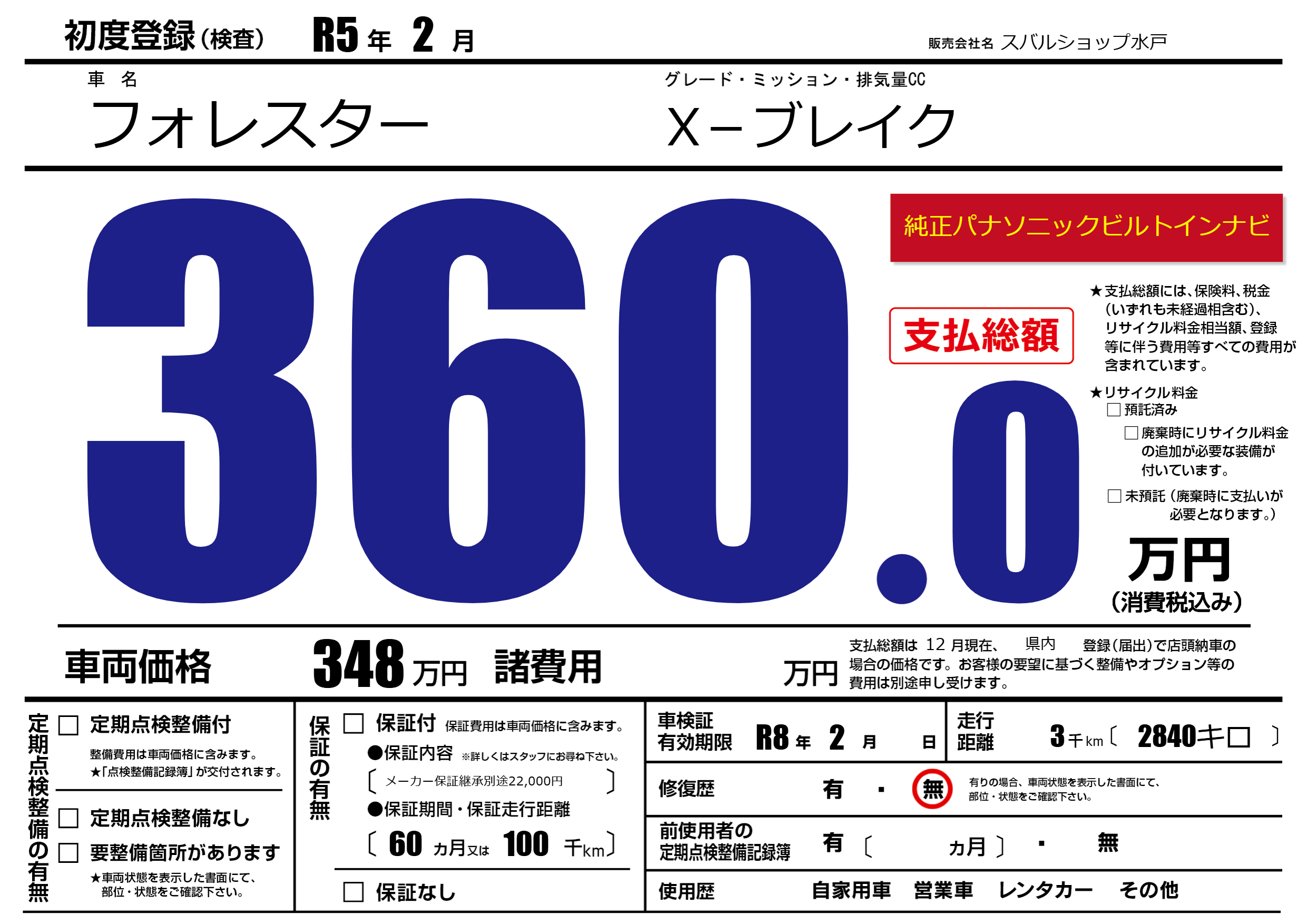 保証なし 保証内容(メーカー保証継承別途22,000円) 60ヶ月または(100)千kmまで |