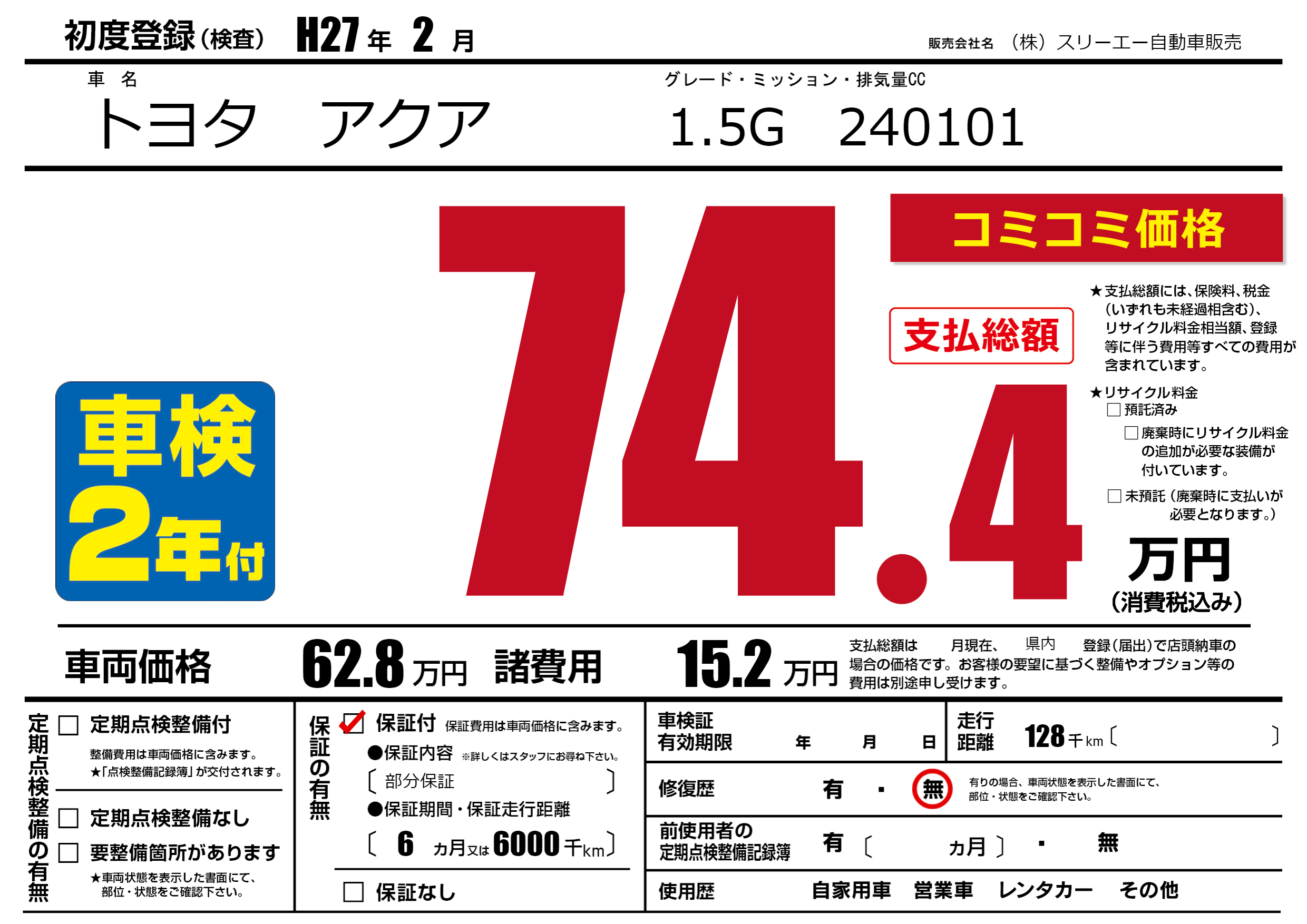 保証付き 保証内容(部分保証) 6ヶ月または(6000)千kmまで |
