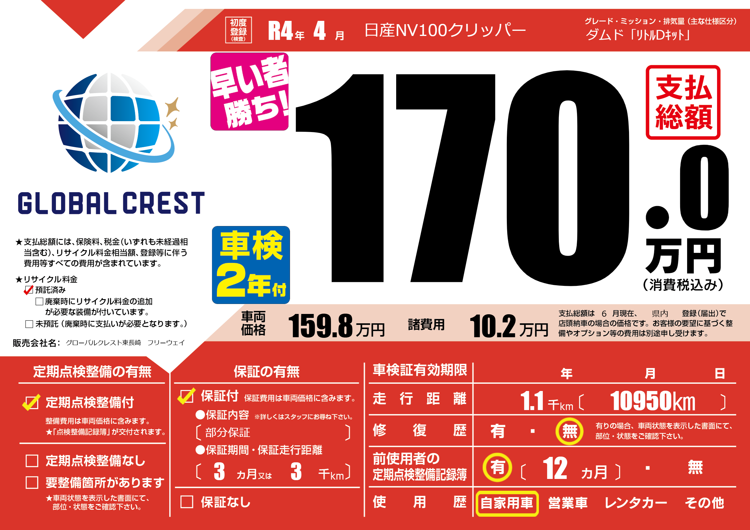 | 走行キロ | 0.1万km | 初年度登録 | R4年4月 |