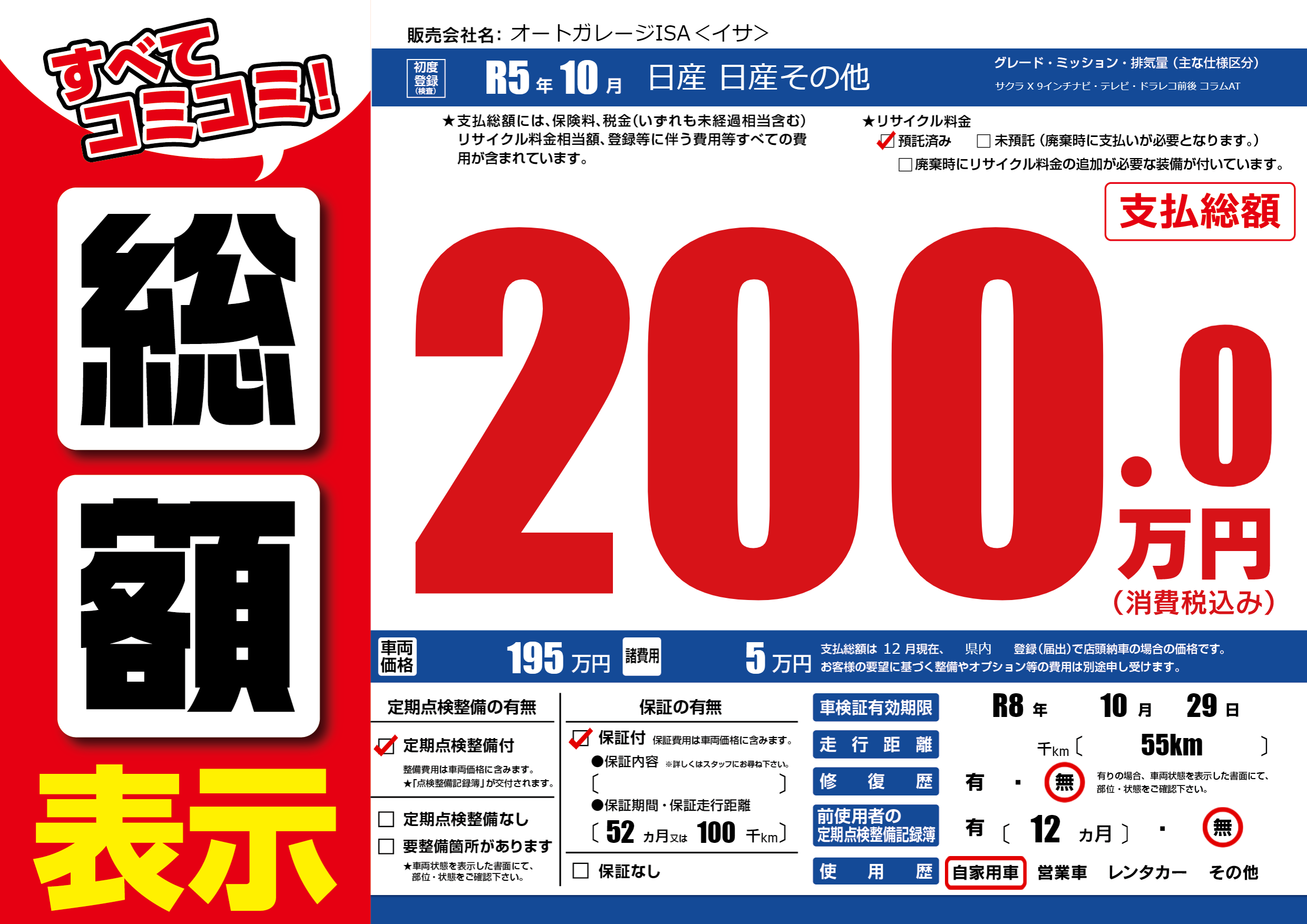 | 走行キロ | - | 初年度登録 | R5年10月 |