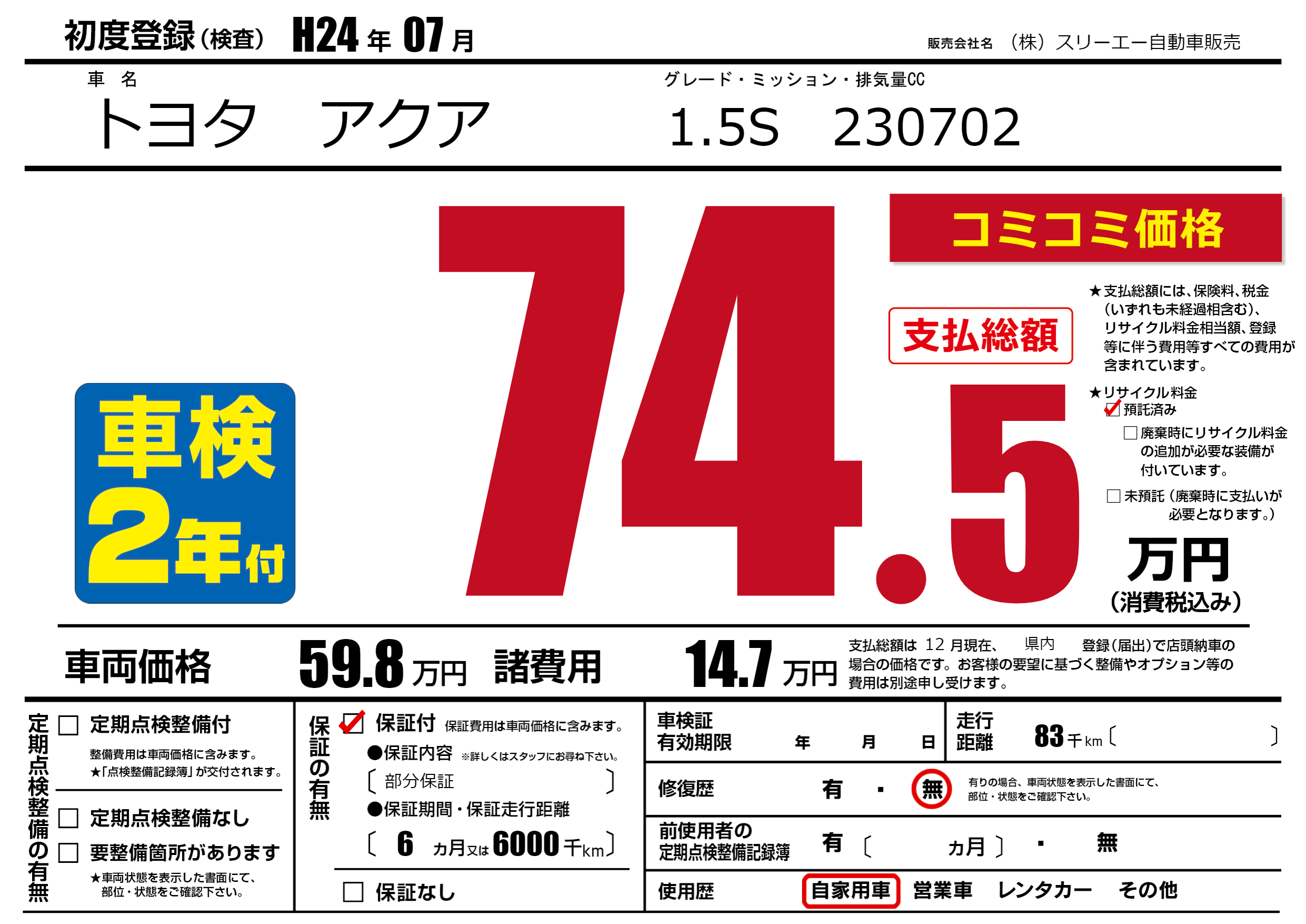 | 走行キロ | 8.3万km | 初年度登録 | H24年07月 |