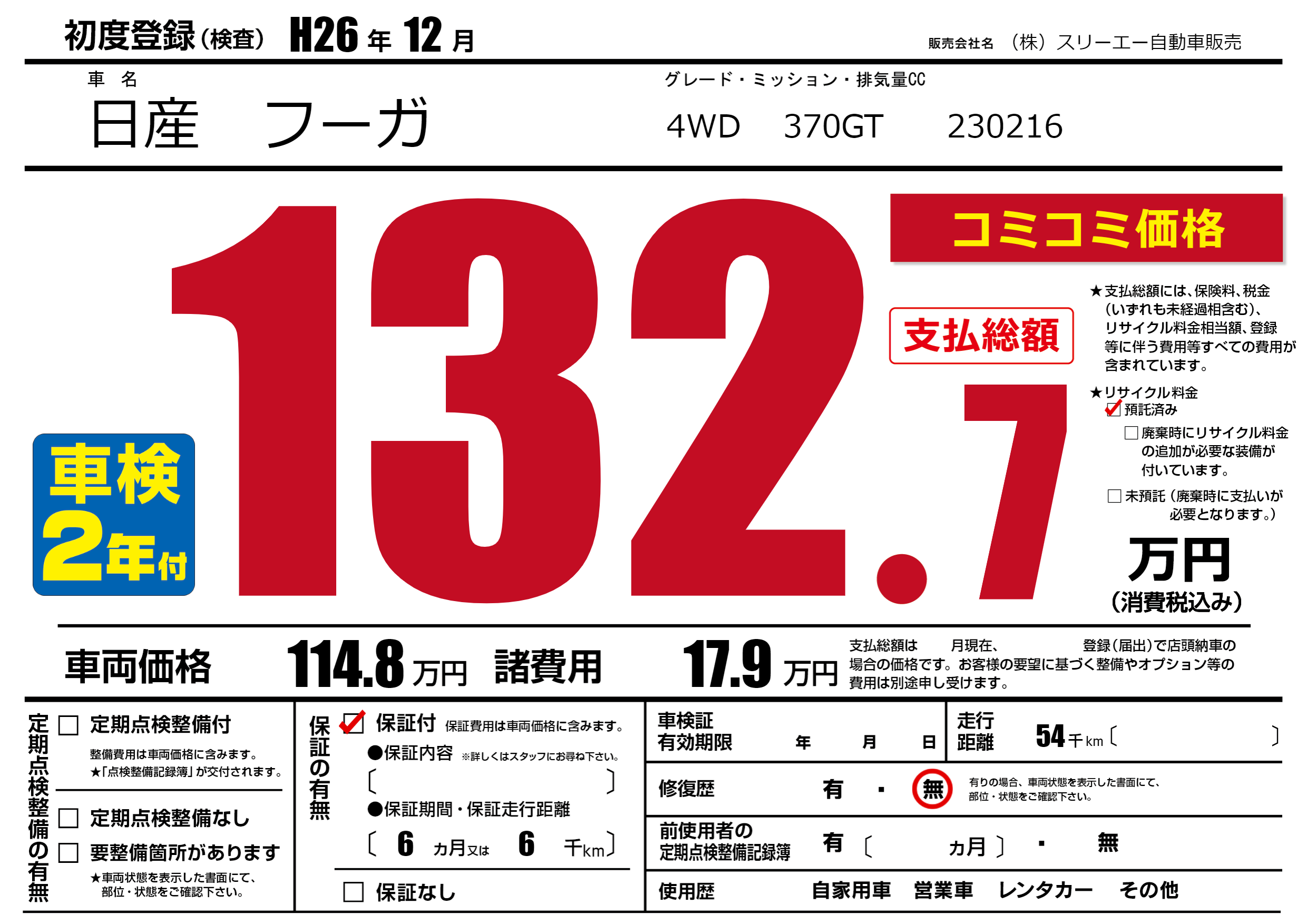 | 走行キロ | 5.4万km | 初年度登録 | H26年12月 |