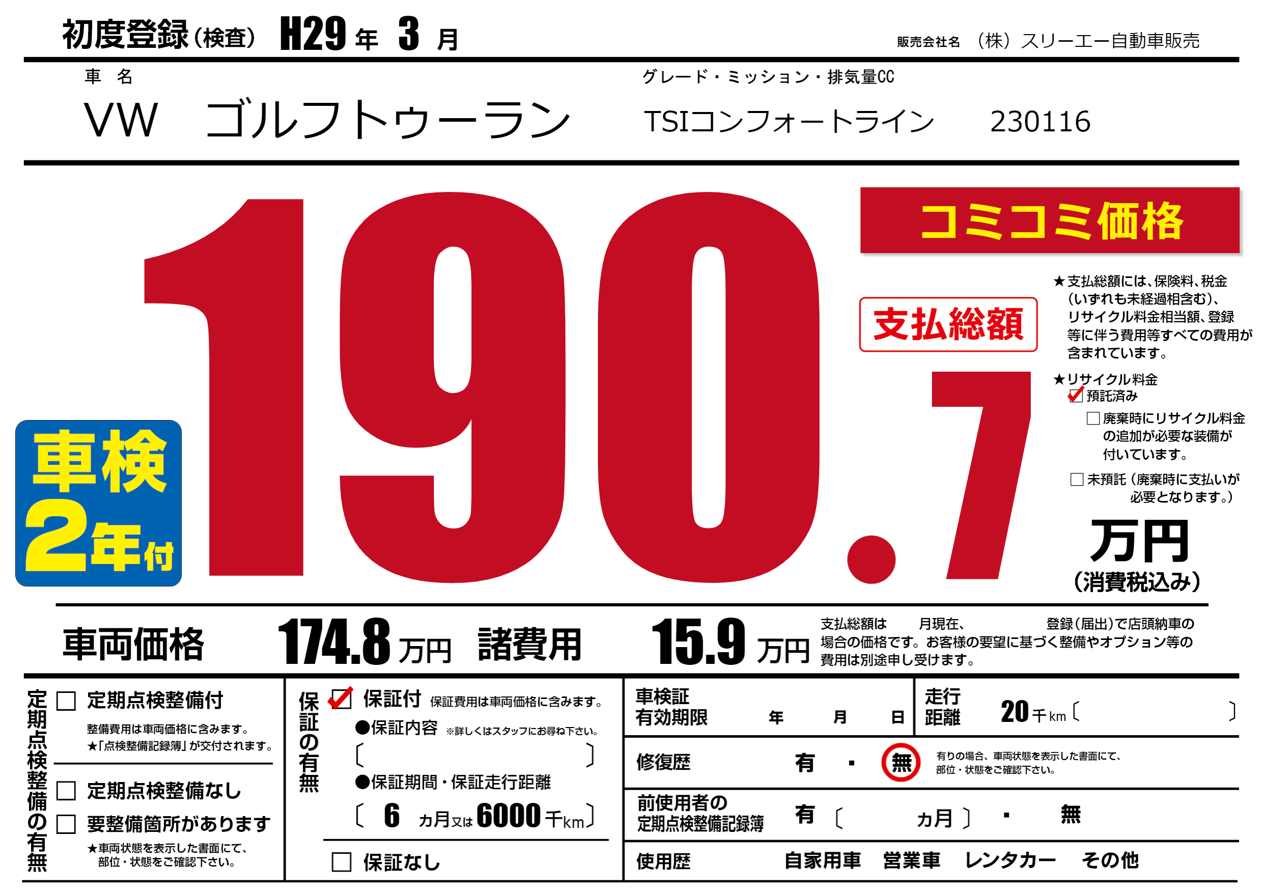 保証付き 保証内容(---) 6ヶ月または(6000)千kmまで |