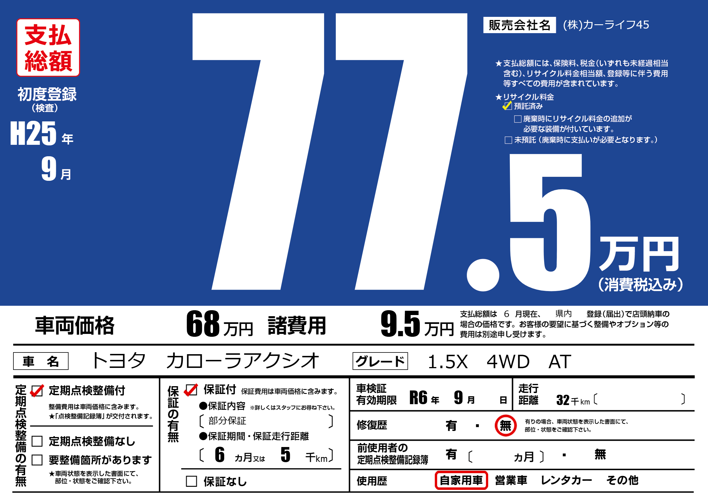 | 車検制限 | R6年 9月 - 日 | ||