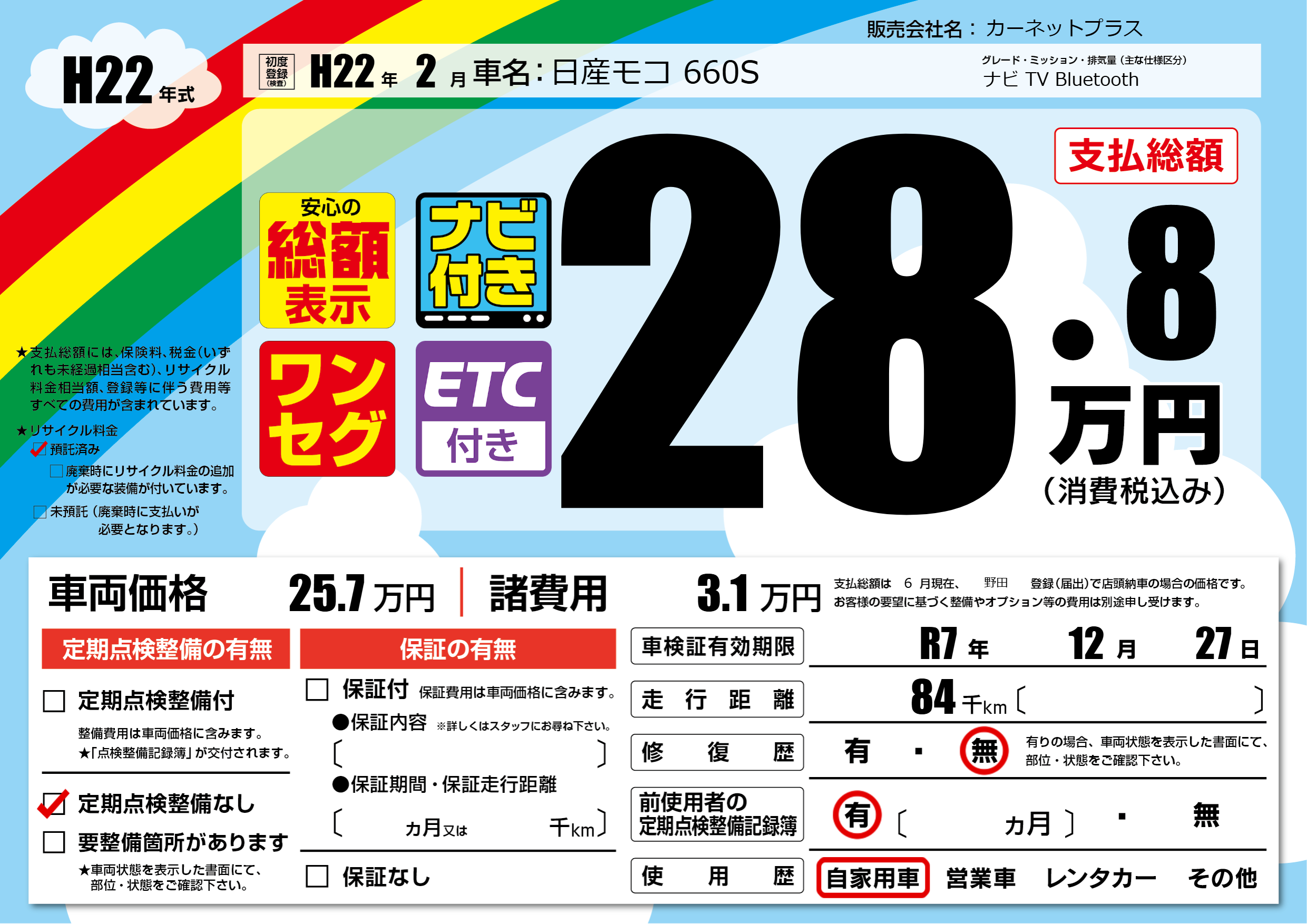 なし | 車検制限 | R7年12月27月 |