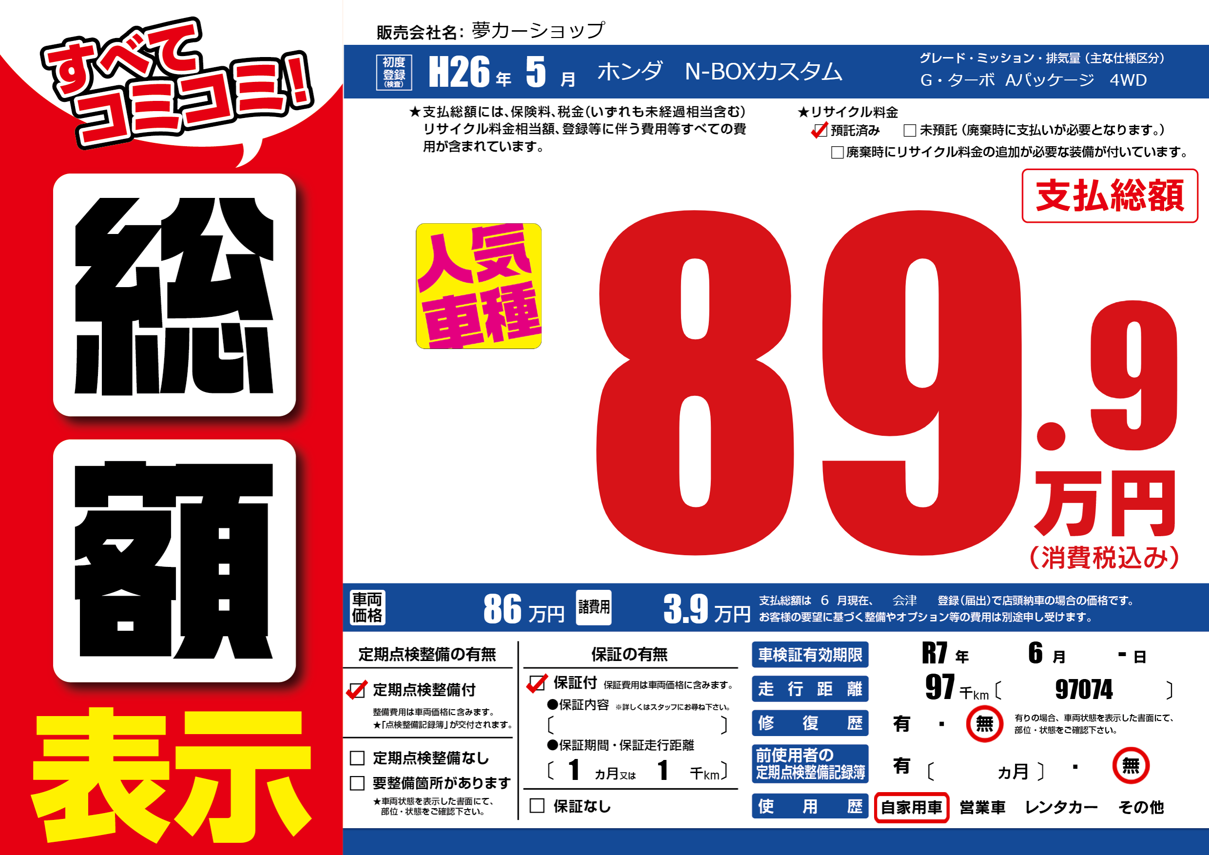 | 走行キロ | 9.7万km | 初年度登録 | H26年5月 |