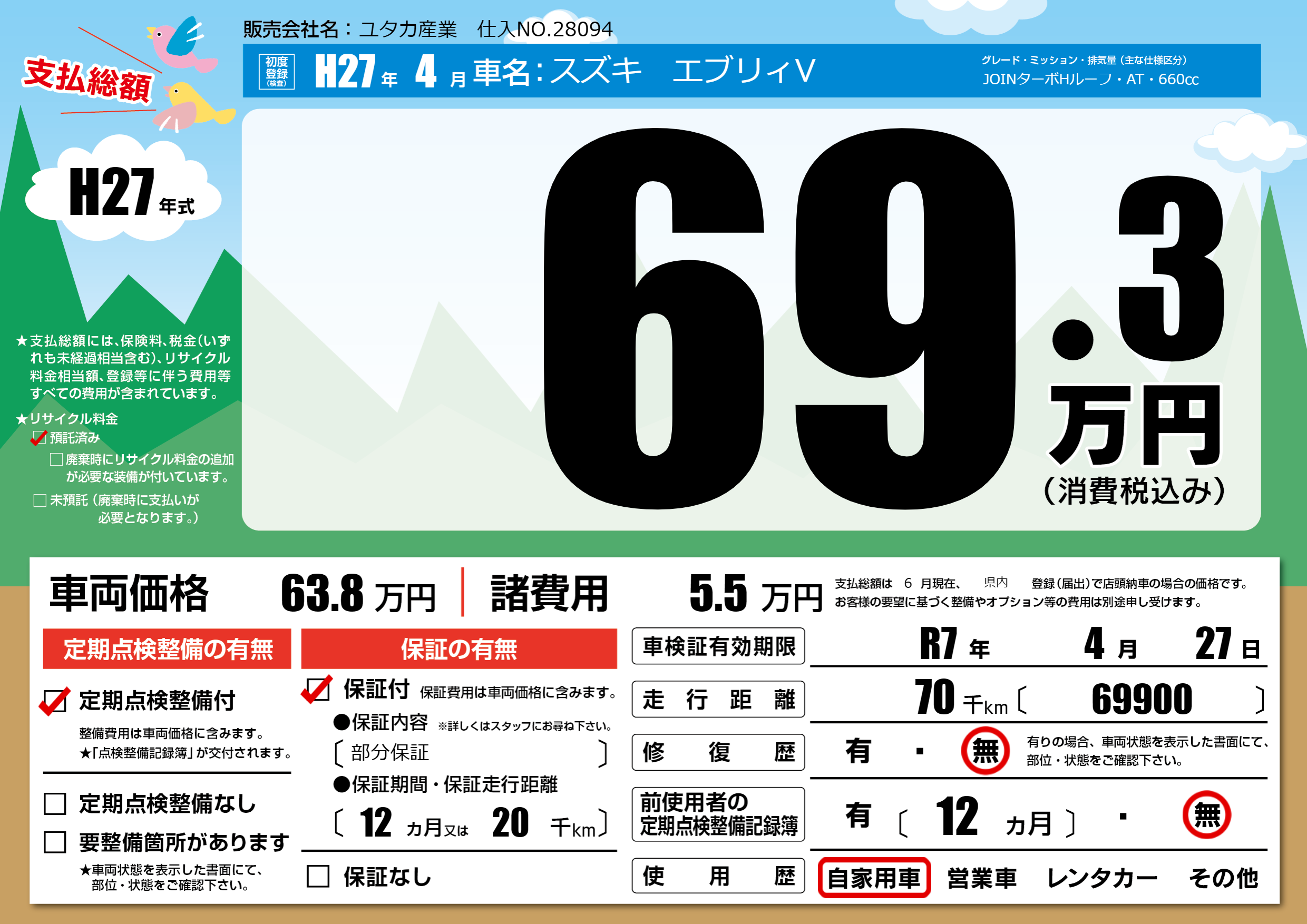 | 走行キロ | 7万km | 初年度登録 | H27年4月 |