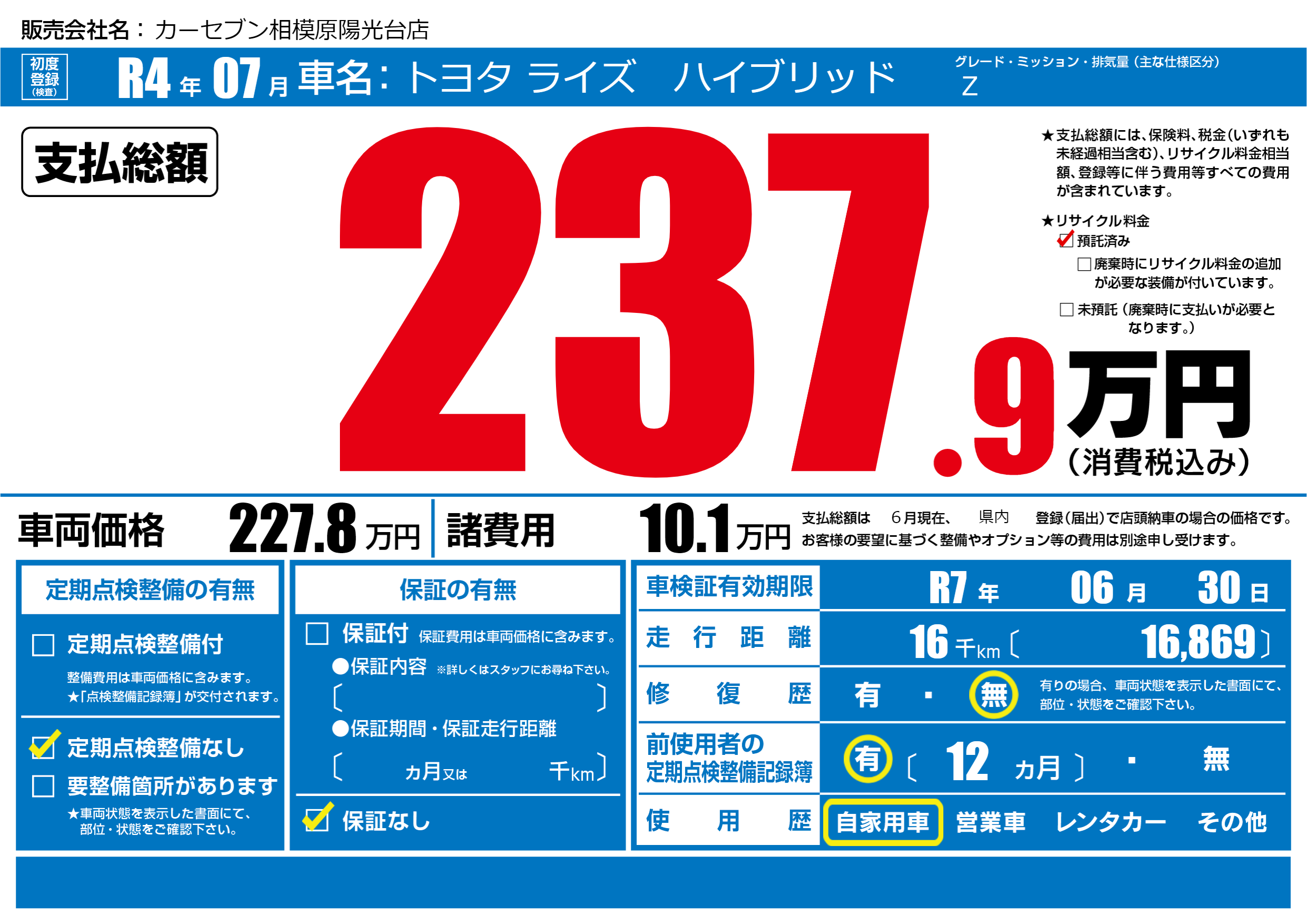 なし | 車検制限 | R7年06月30月 |