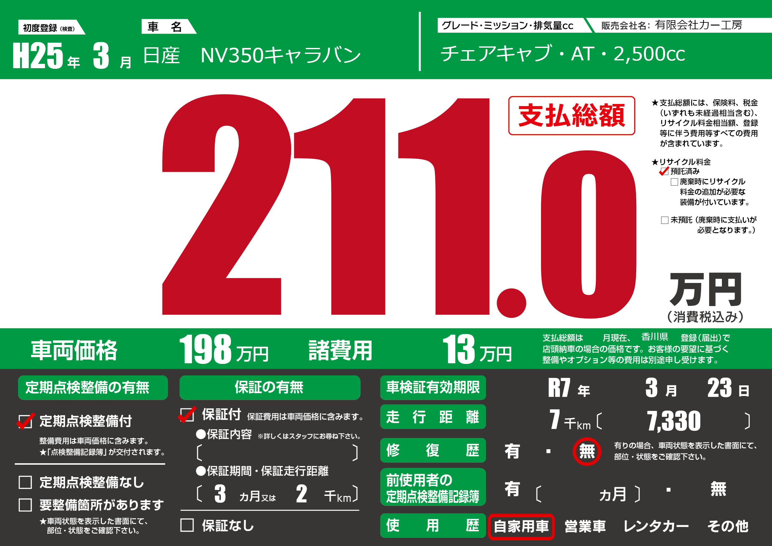| 車名 | 日産 NV350キャラバン | グレード ミッション 排気量 |