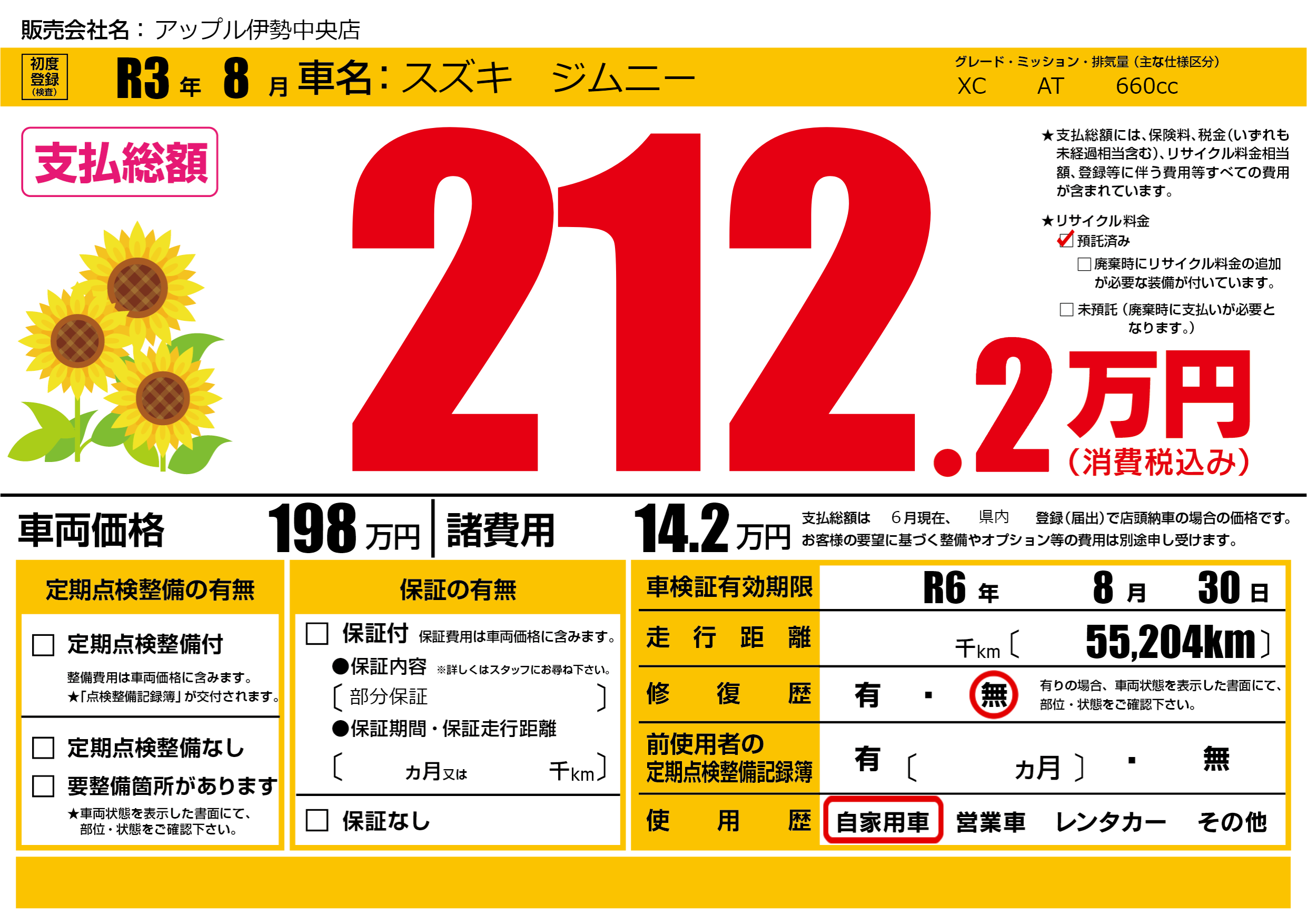 | 車名 | スズキ ジムニー | グレード ミッション 排気量 |