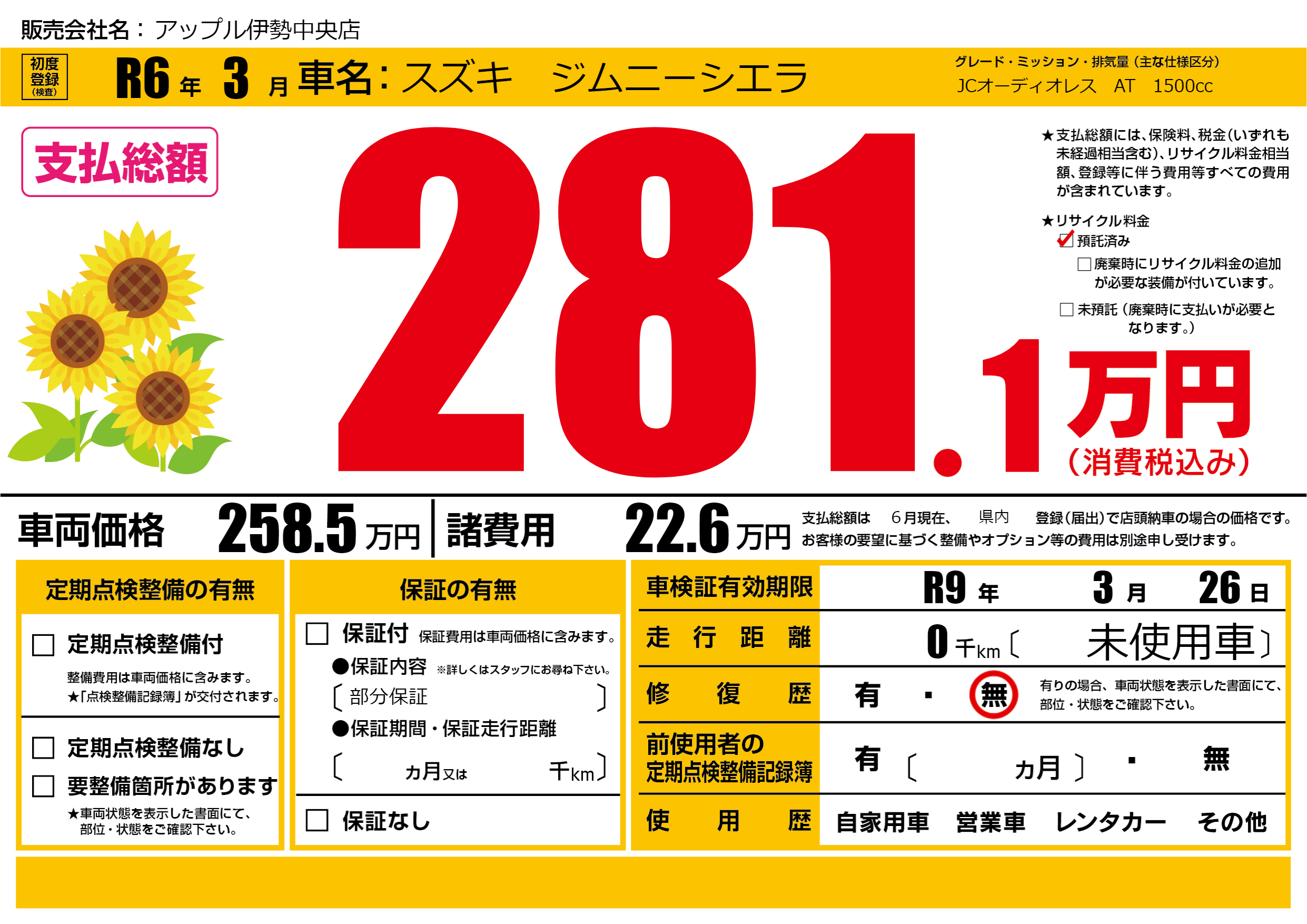 | 車名 | スズキ ジムニーシエラ | グレード ミッション 排気量 |