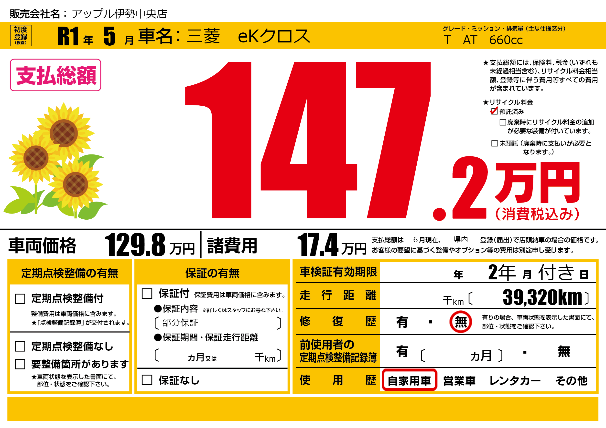 | 車名 | 三菱 eKクロス | グレード ミッション 排気量 |