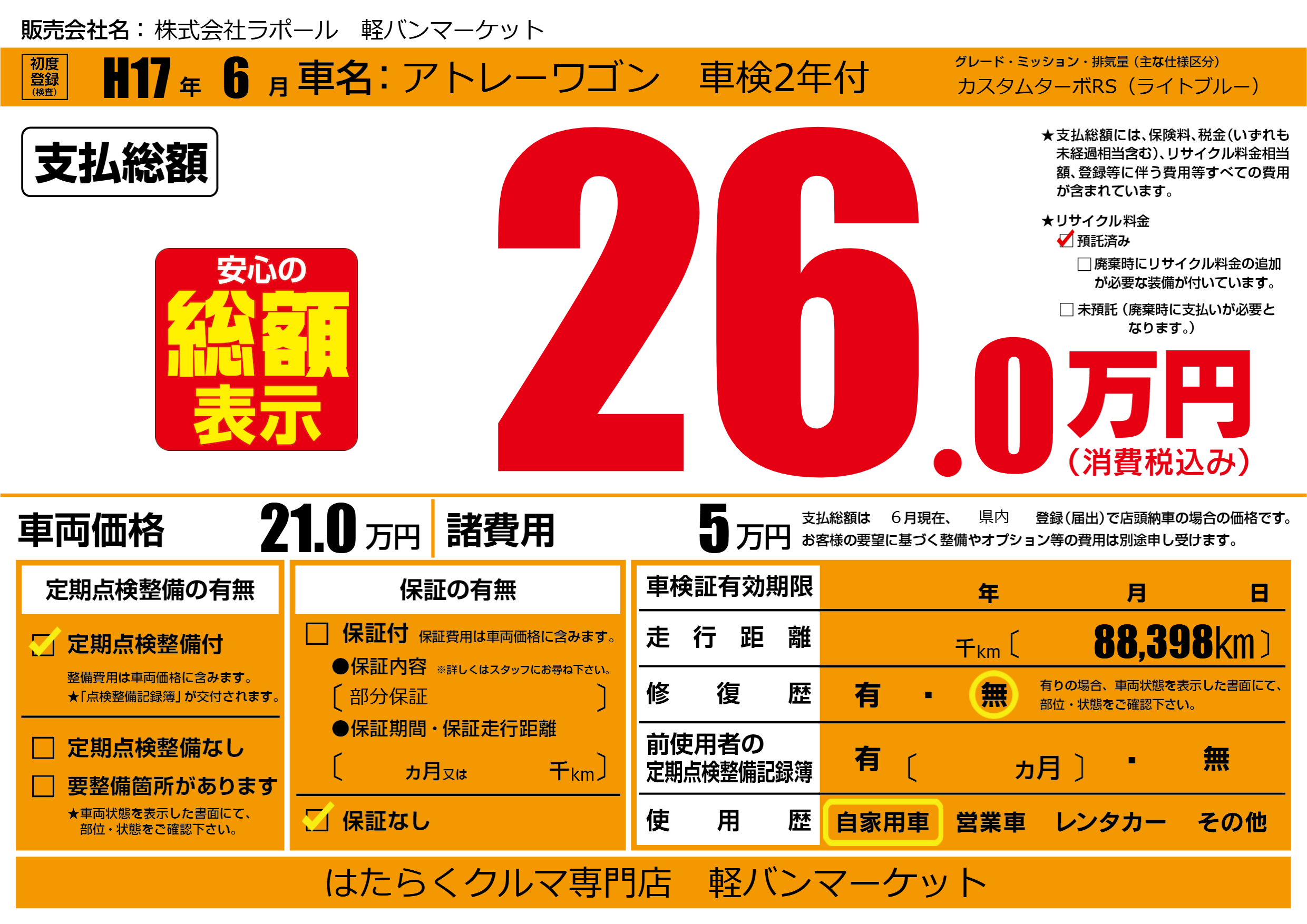 | 車名 | アトレーワゴン 車検2年付 | グレード ミッション 排気量 |
