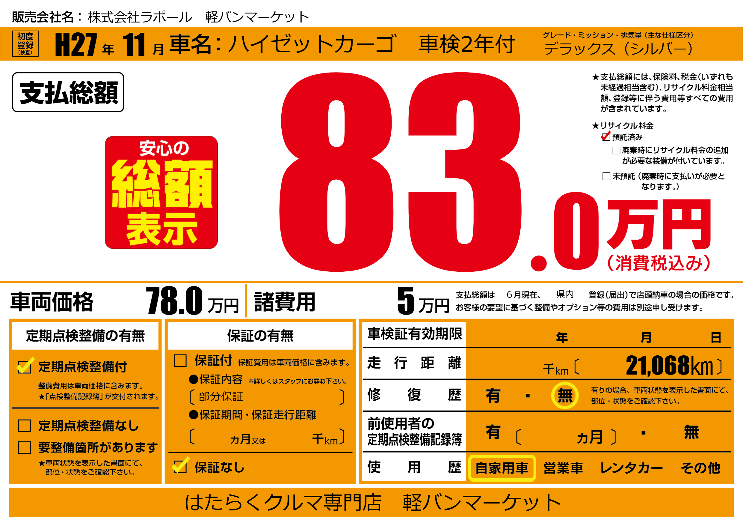 保証なし 保証内容(部分保証) ---ヶ月または()千kmまで |