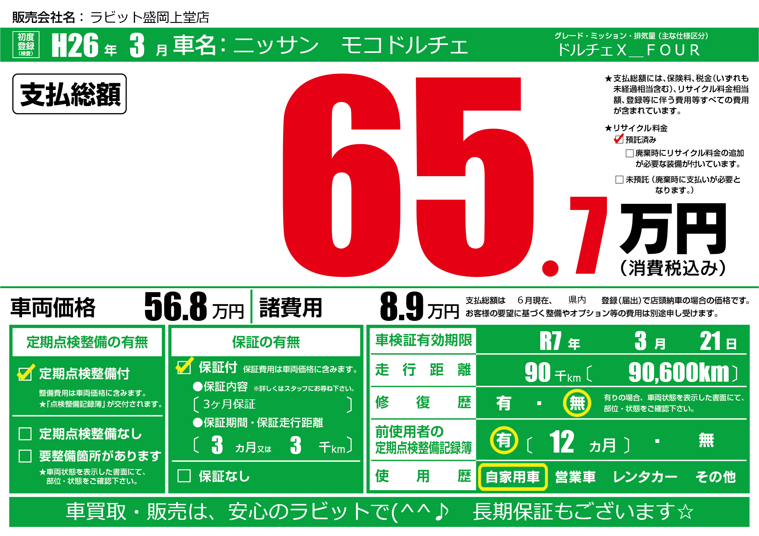 | 走行キロ | 9万km | 初年度登録 | H26年3月 |