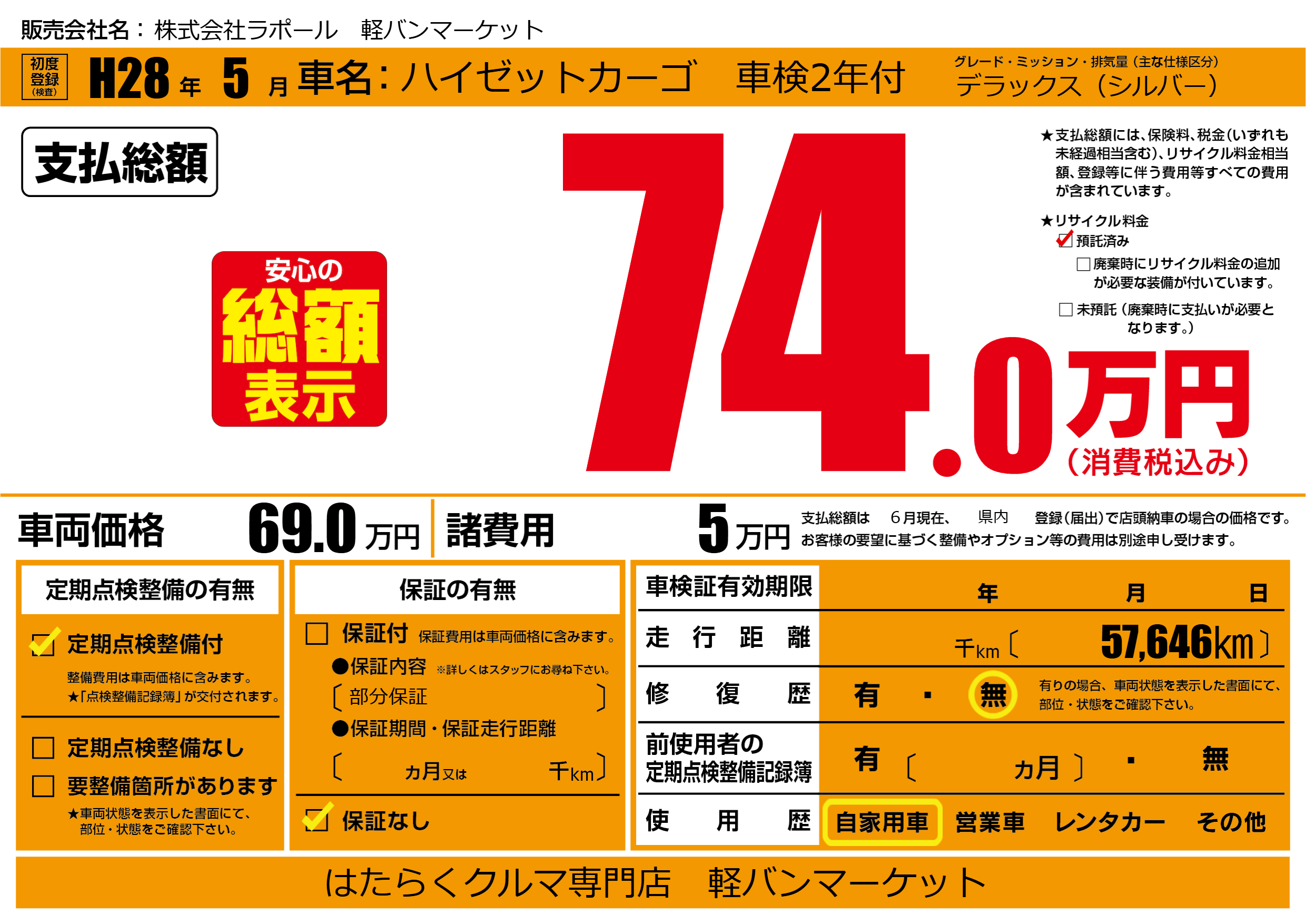 | 車名 | ハイゼットカーゴ 車検2年付 | グレード ミッション 排気量 |