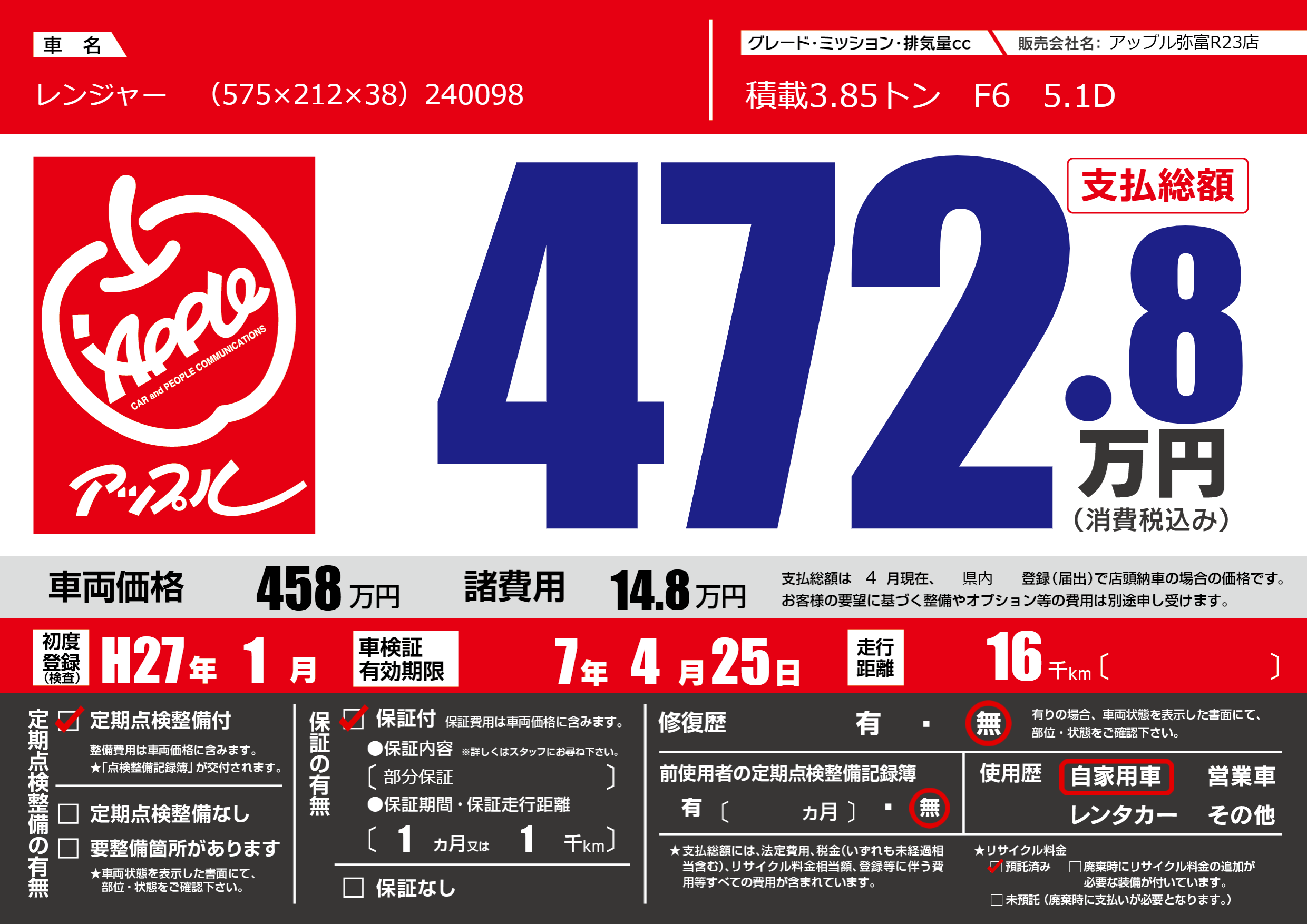 | 車名 | レンジャー (575×212×38)240098 | グレード ミッション 排気量 |