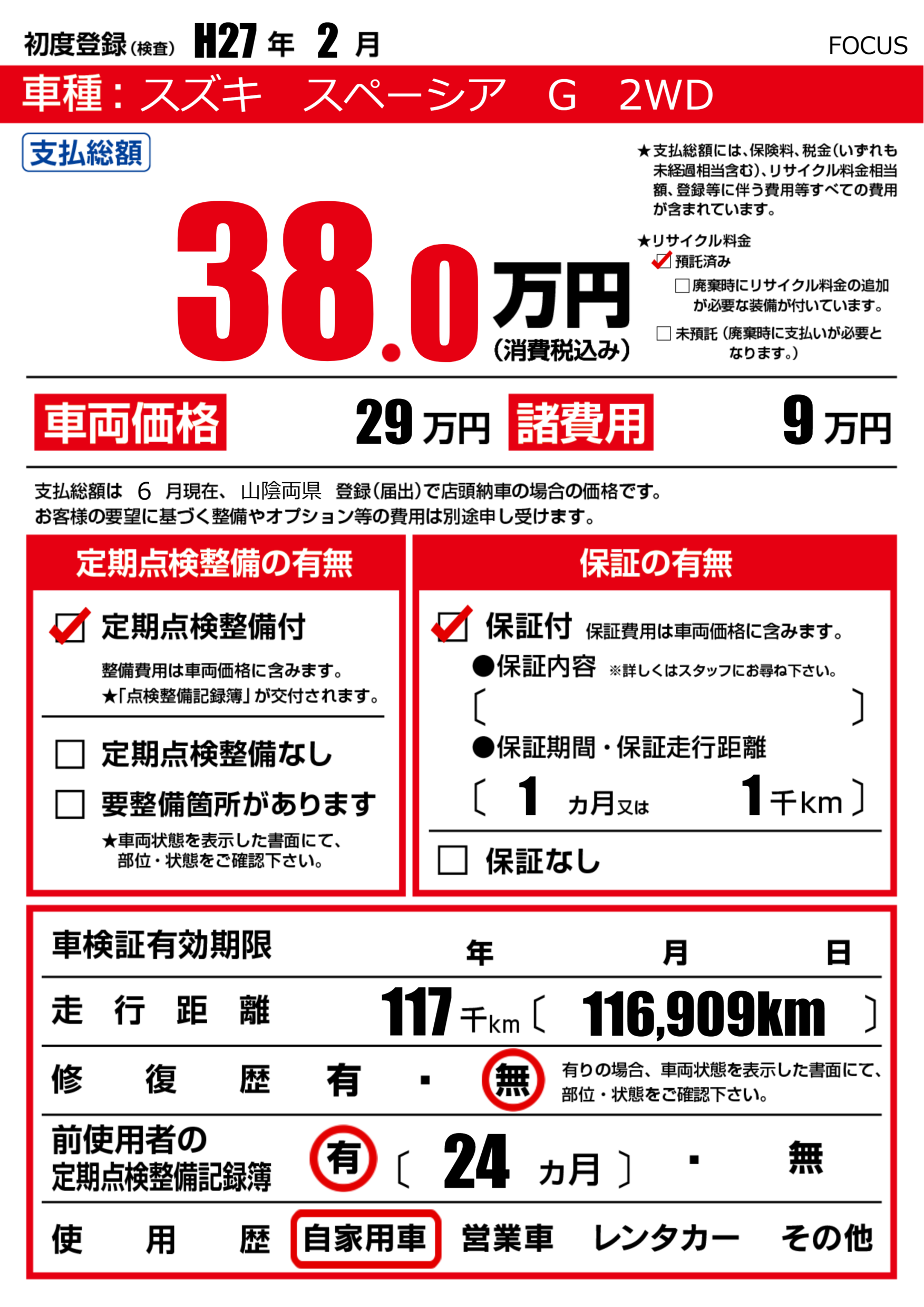 | 走行キロ | 11.7万km | 初年度登録 | H27年2月 |