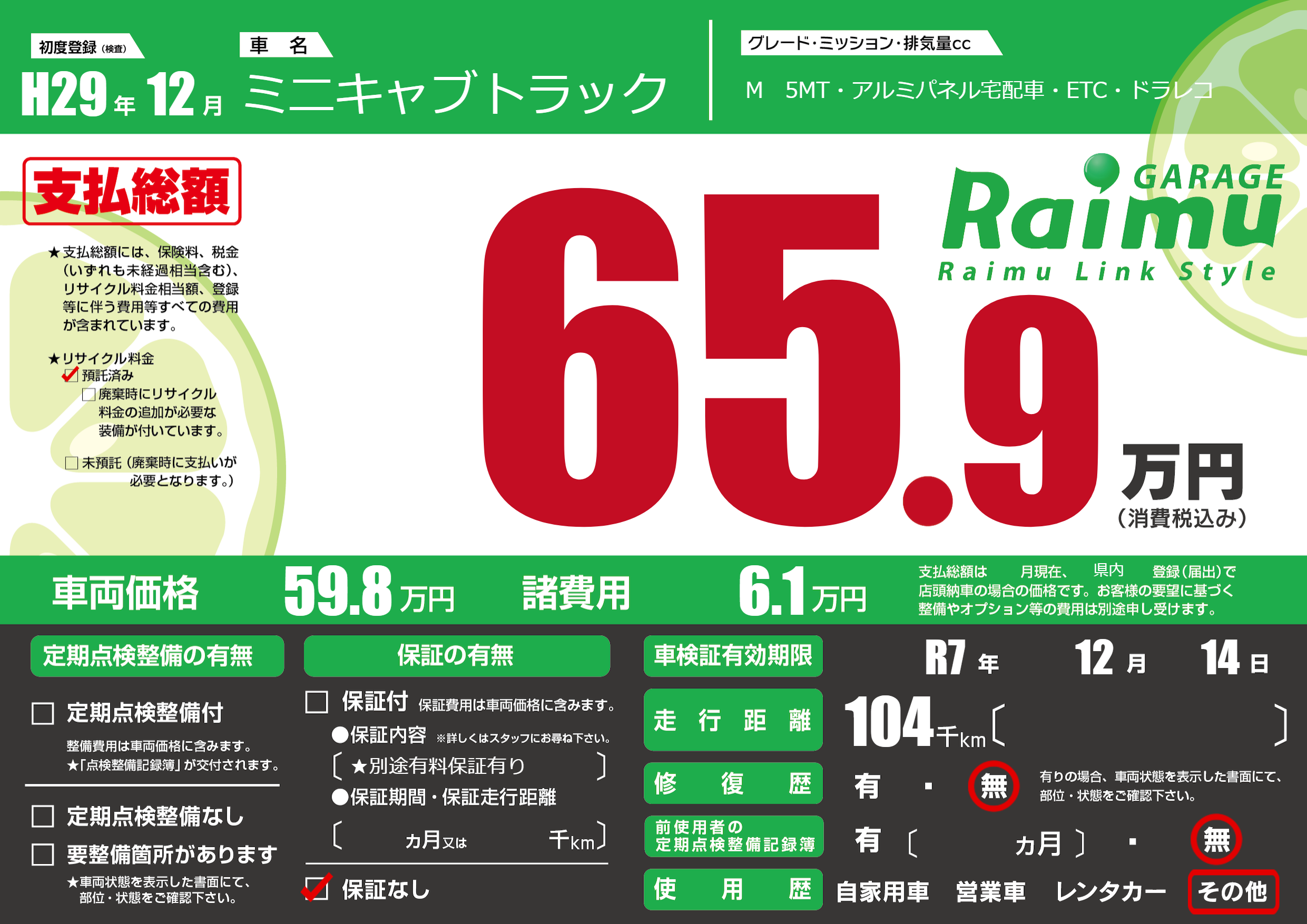 | 車検制限 | R7年 12月 14日 | ||