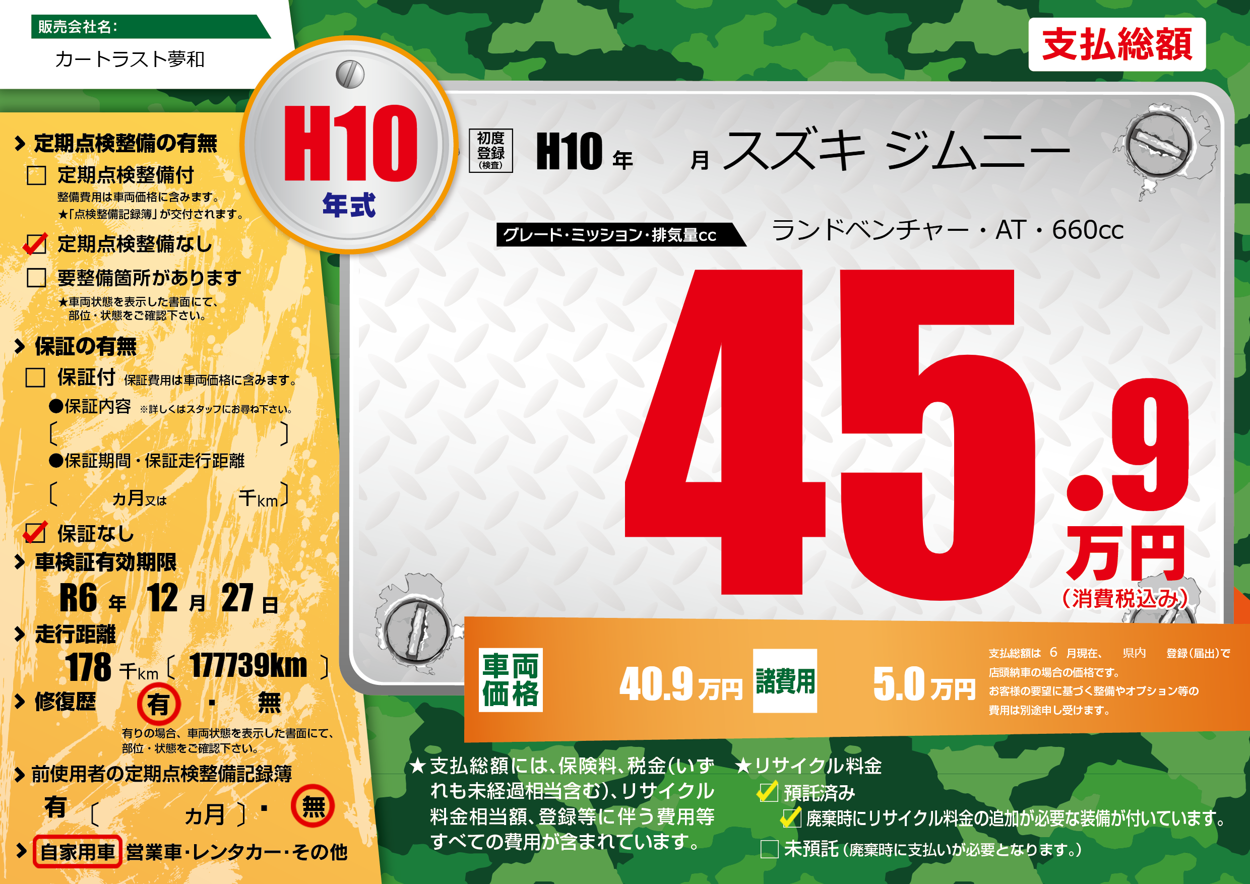 | 車名 | スズキ ジムニー | グレード ミッション 排気量 |