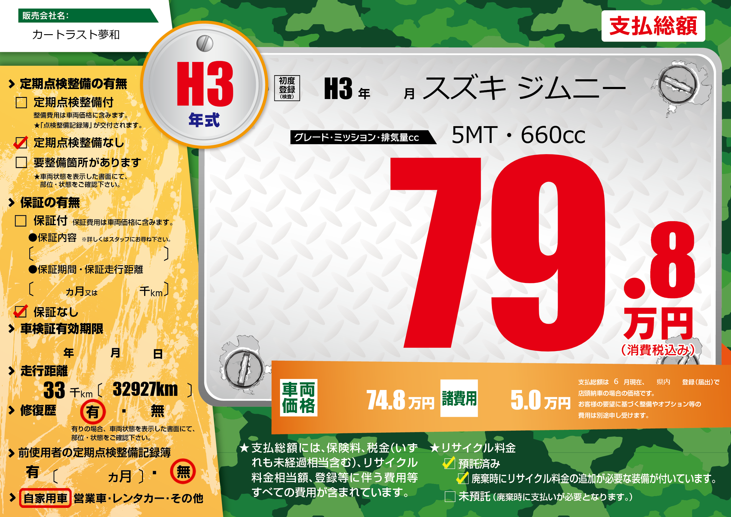 | 走行キロ | 3.3万km | 初年度登録 | H3年---月 |