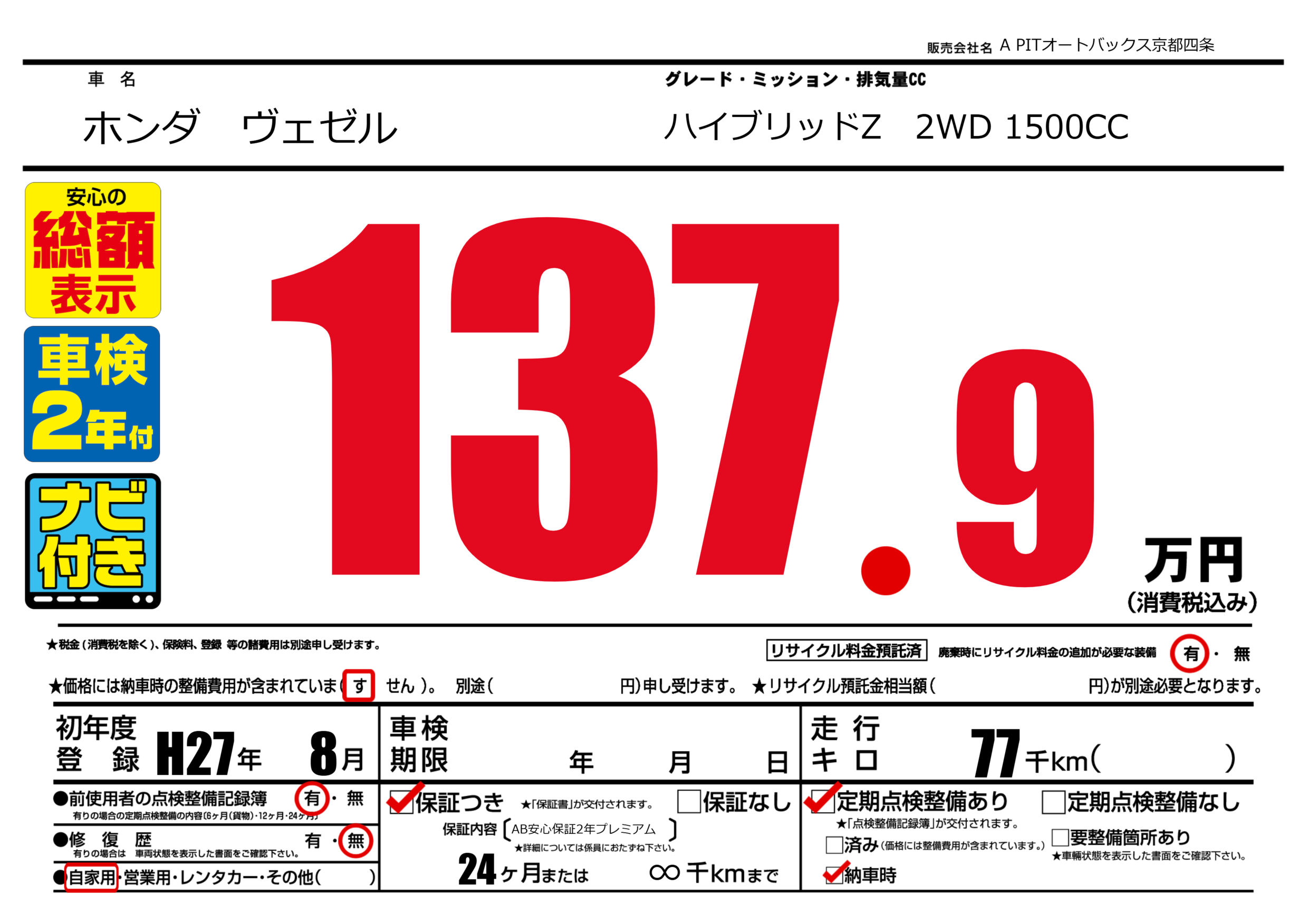 | 車名 | ホンダ ヴェゼル | グレード ミッション 排気量 |